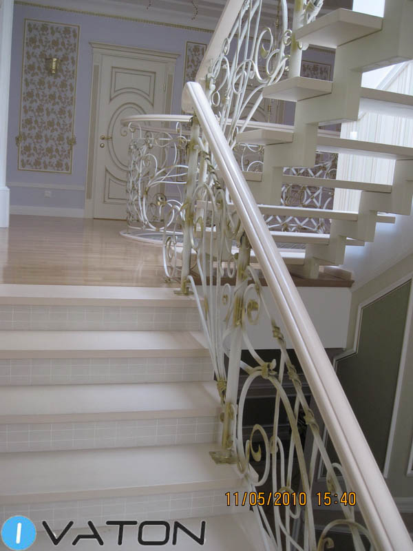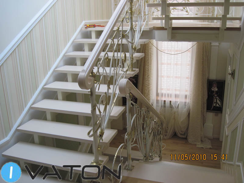 Конструктивная особенность этой лестницы – два металлических несущих косоура из профильной трубы в сочетании с белыми дубовыми ступенями. Дополняют эту красивую лестницу плавные изогнутые линии белого с золотой патиной кованого ограждения. Завершающий штрих – дубовый поручень с легким патинированием.