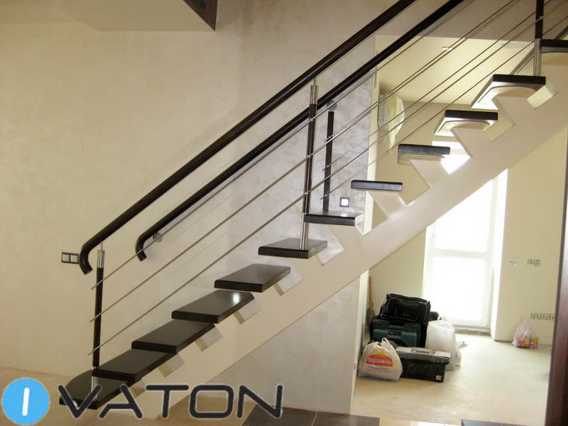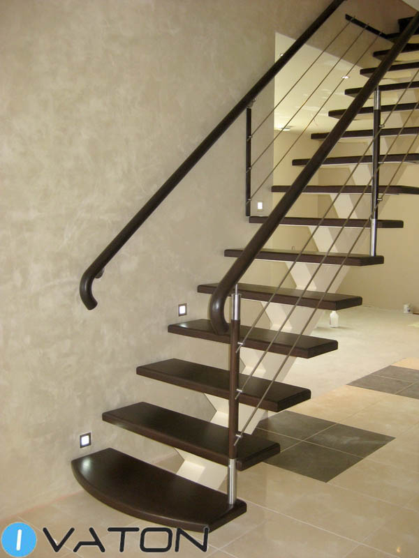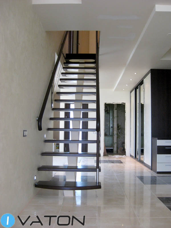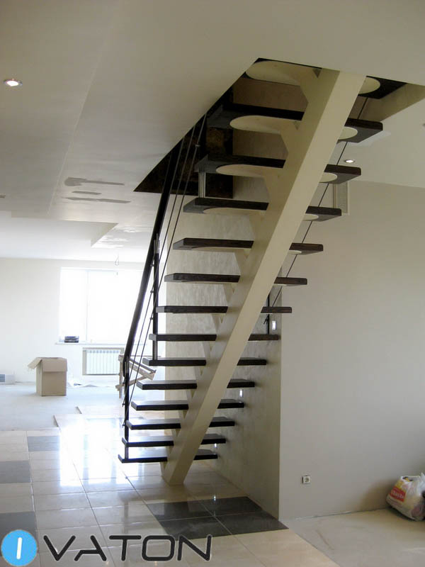 В этой лестнице достигнуто оптимальное сочетание центрального металлического косоура и тонированного дуба. Ограждение из струн из нержавейки оканчивается круглым дубовым поручнем.