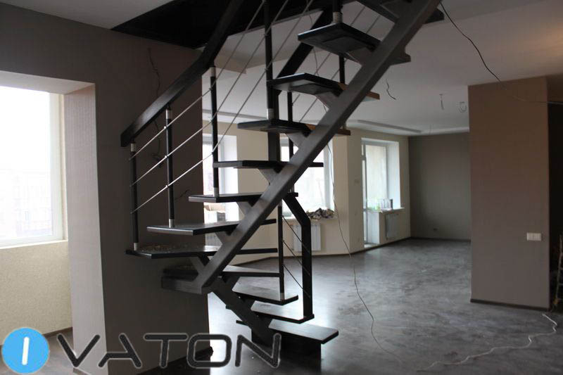 Лестница на центральном металлическом косоуре с поворотными ступенями из сосны, тонированными в темный цвет. Ограждение – струны из нержавеющей стали, стойки комбинированные – «металл-дерево-металл».