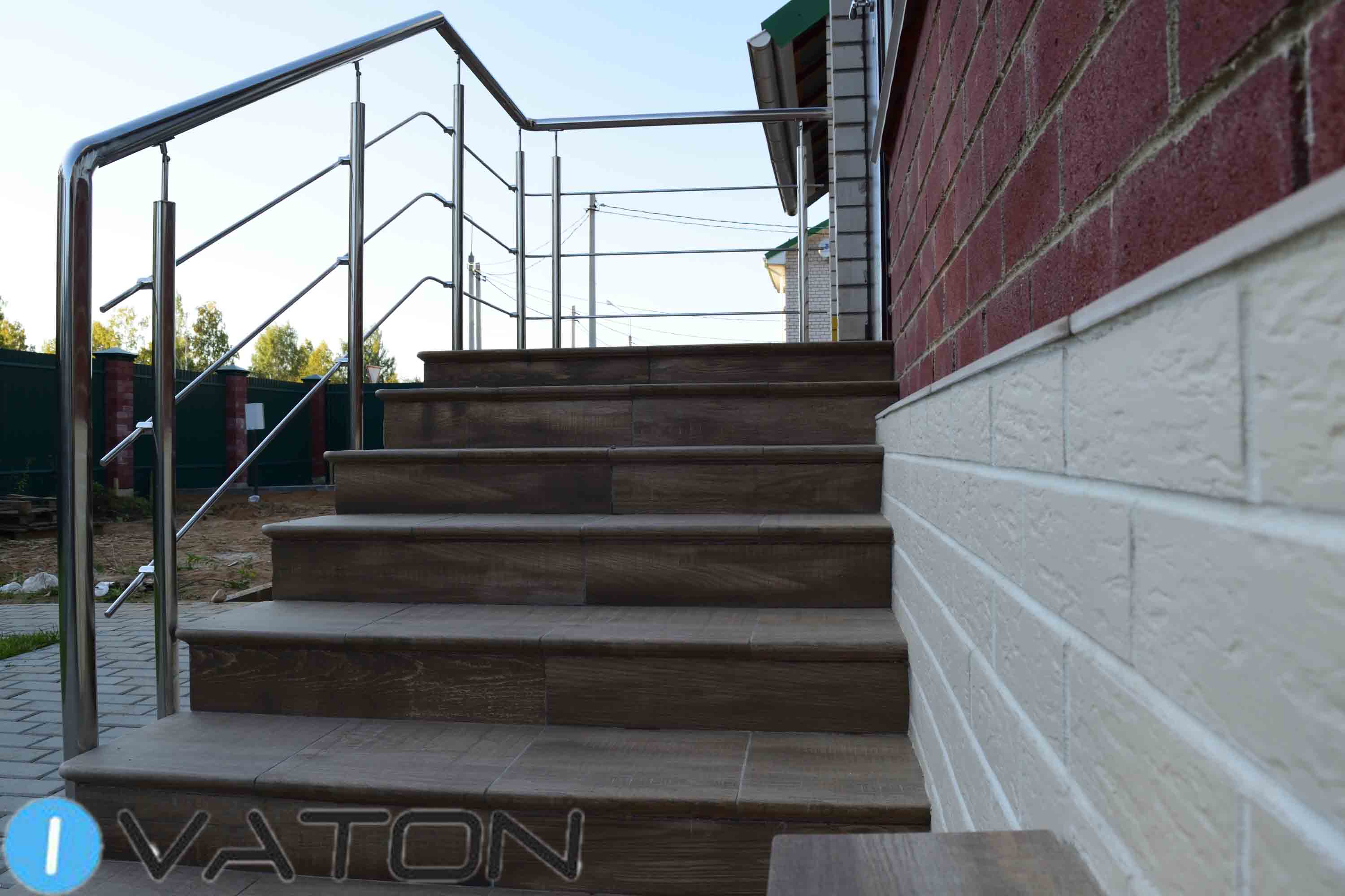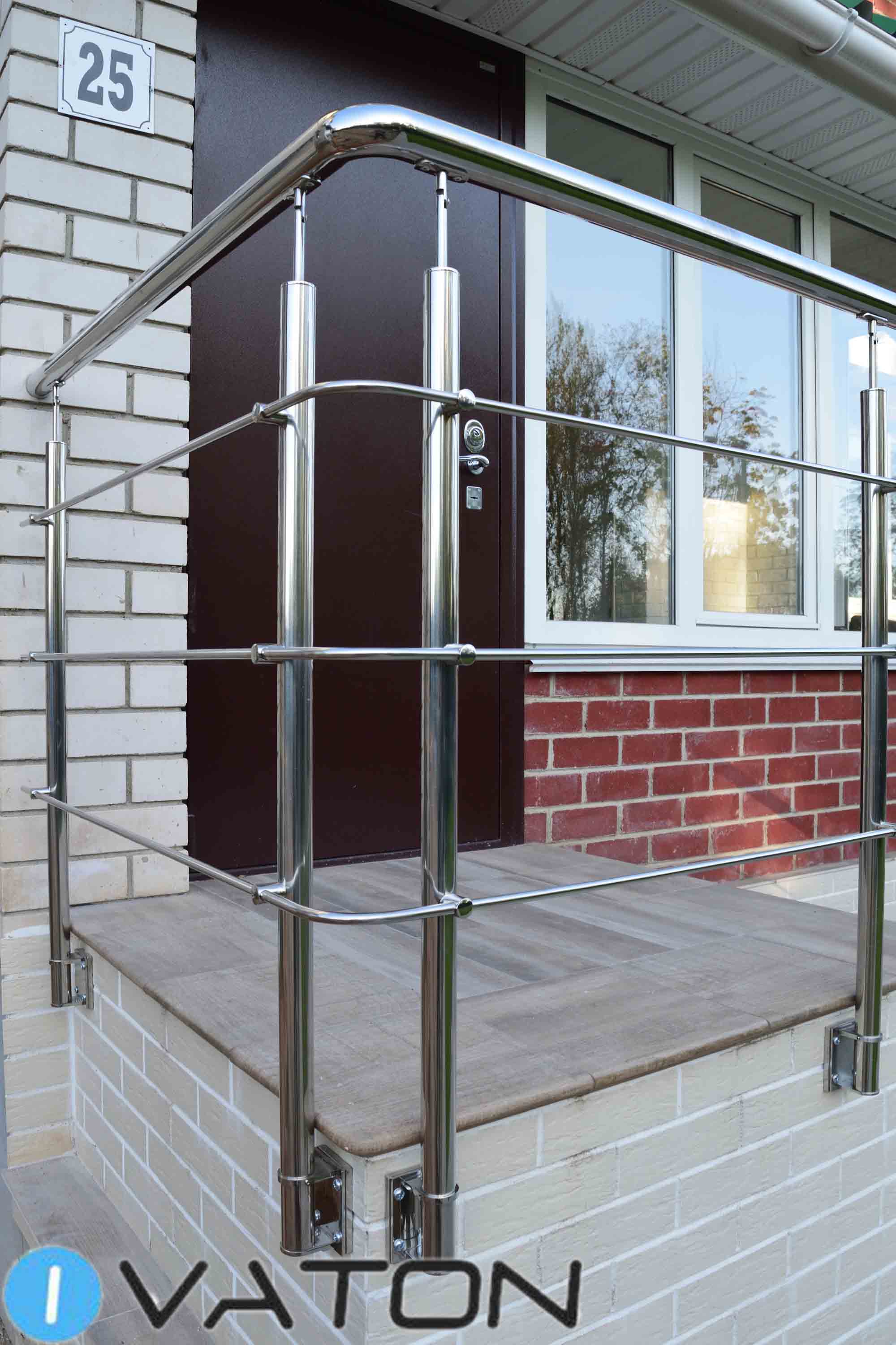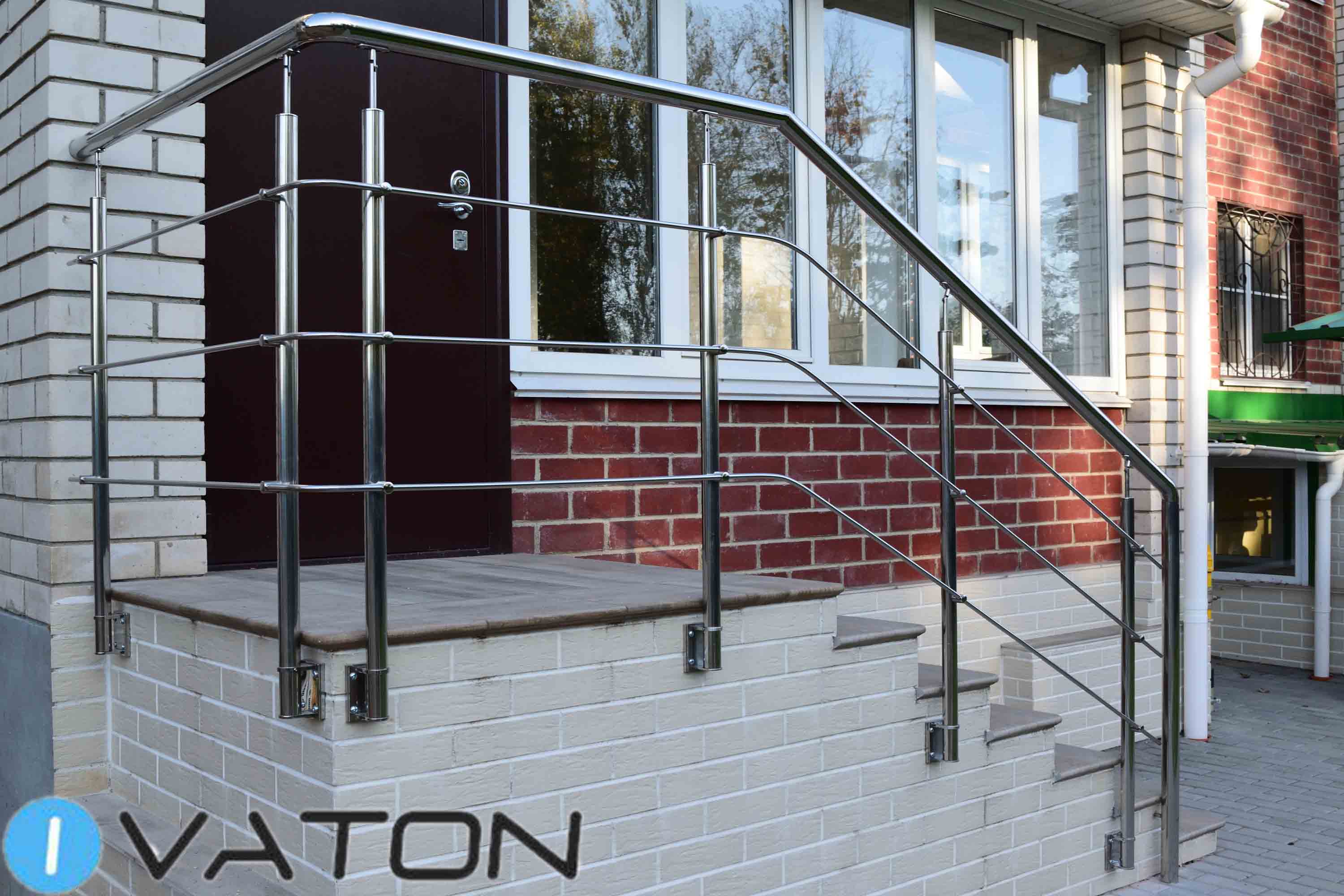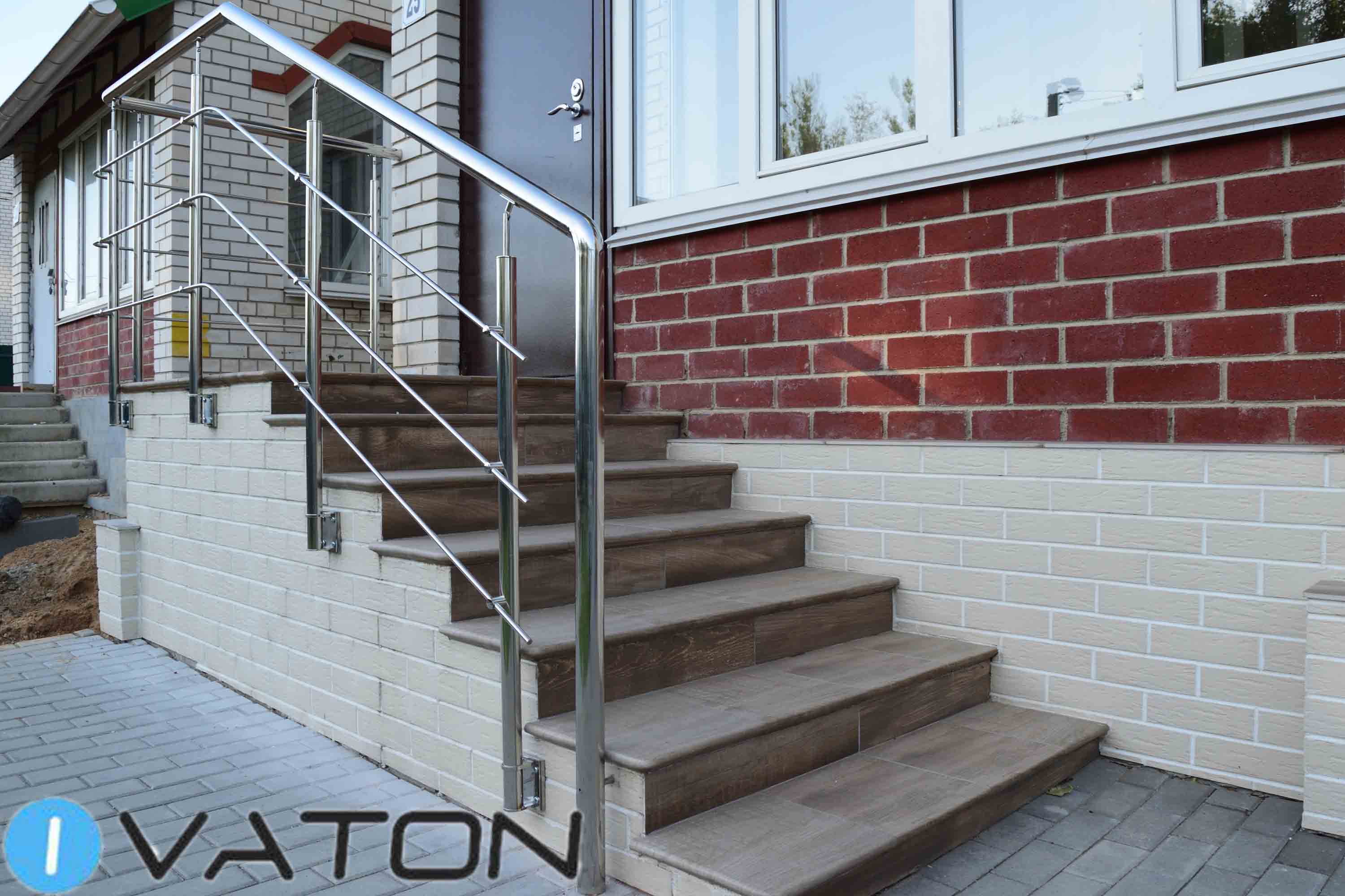 Ограждение из нержавеющей стали, круглый поручень диаметром 50 мм., гнутые прутки - 12 мм. Стойки ограждения крепятся к бетонному основанию крыльца с помощью специальных кронштейнов.