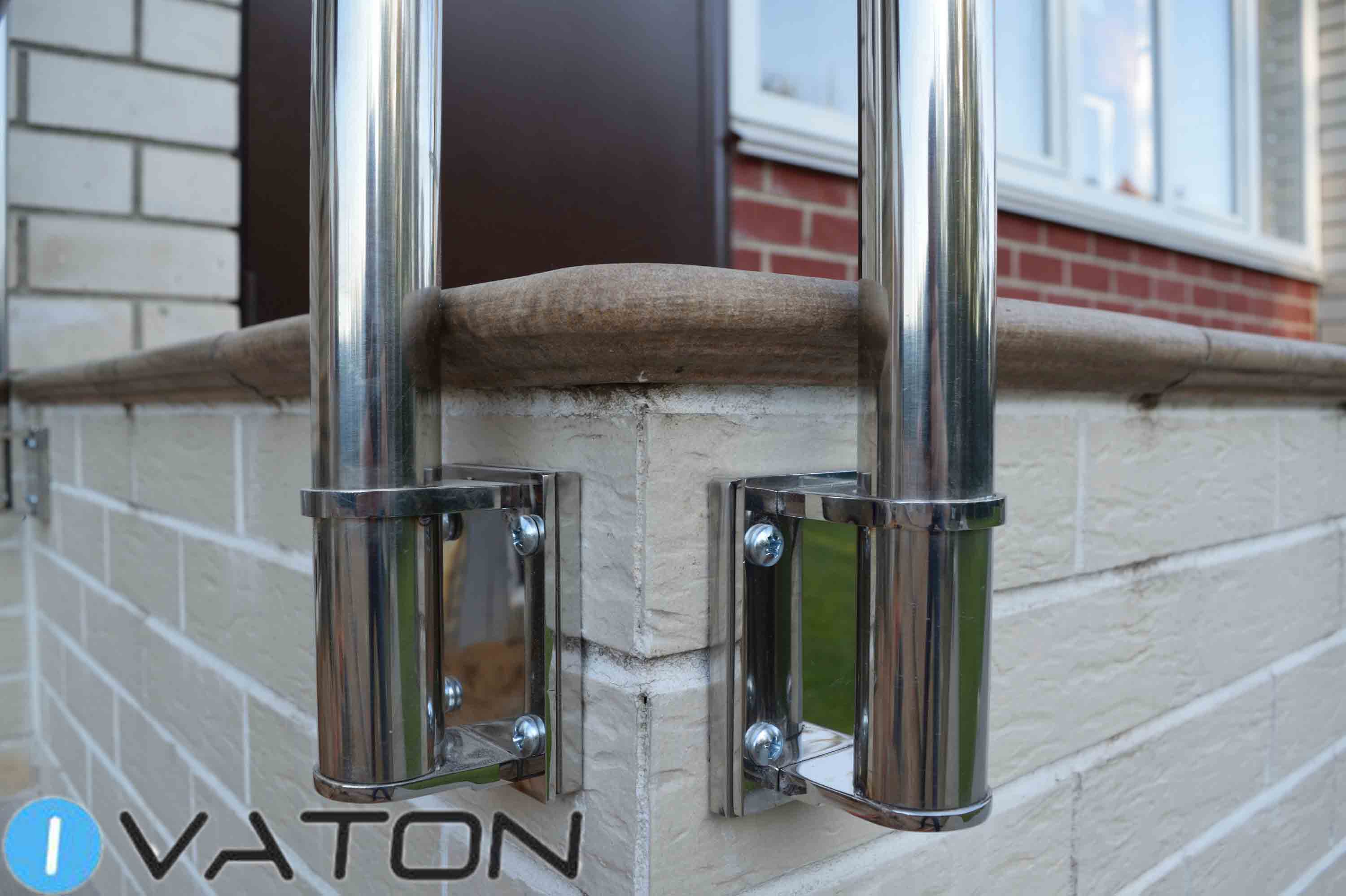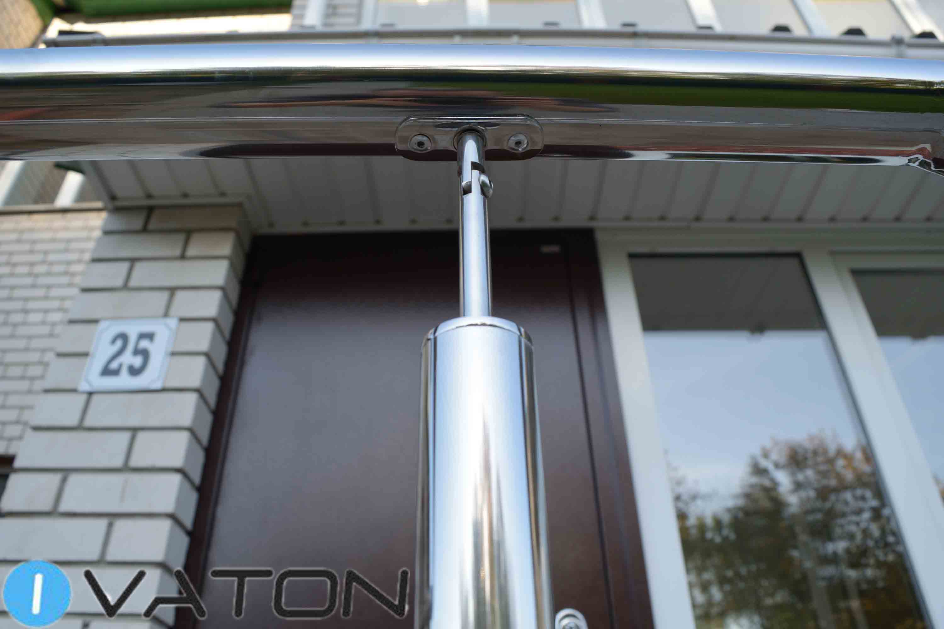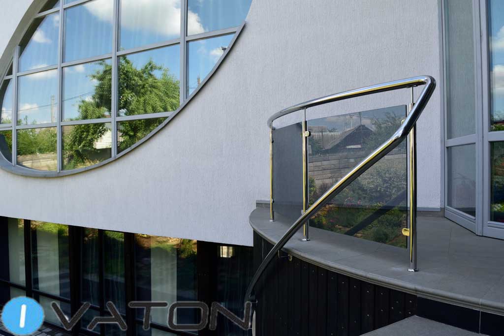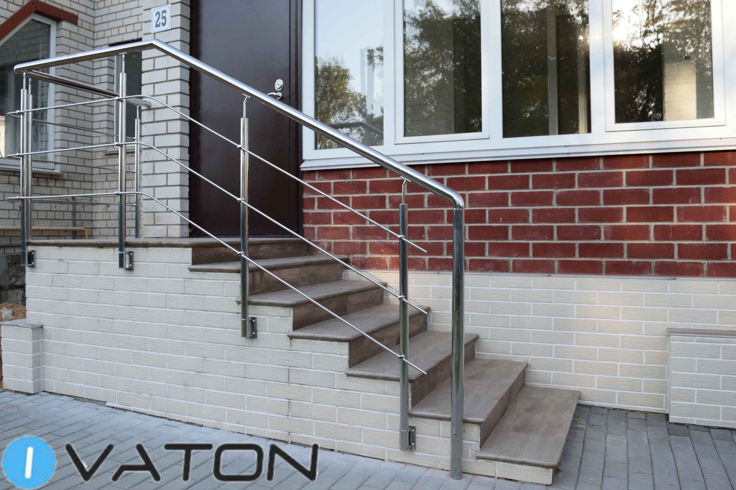 Ограждение из нержавеющей стали, круглый поручень диаметром 50 мм., гнутые прутки - 12 мм. Стойки ограждения крепятся к бетонному основанию крыльца с помощью специальных кронштейнов.