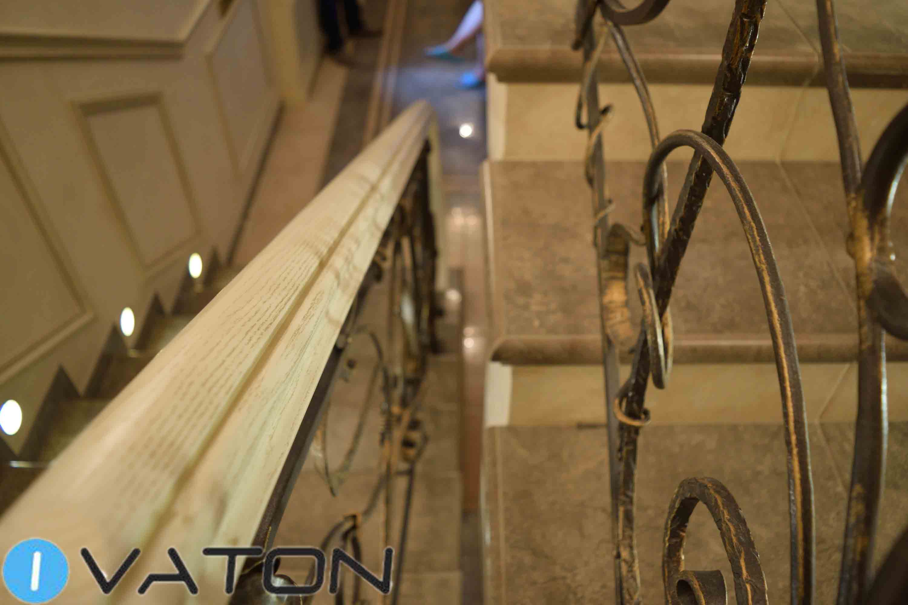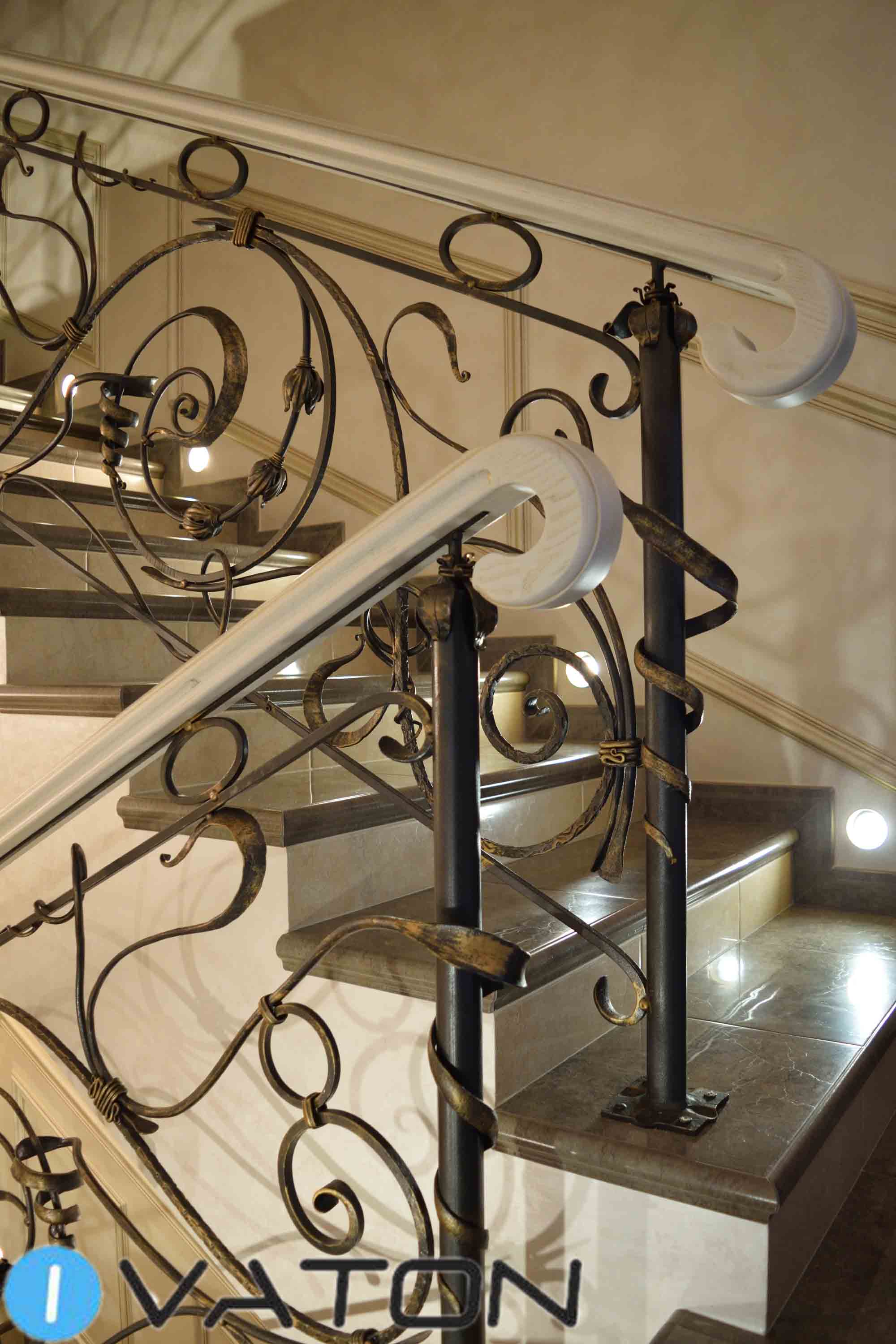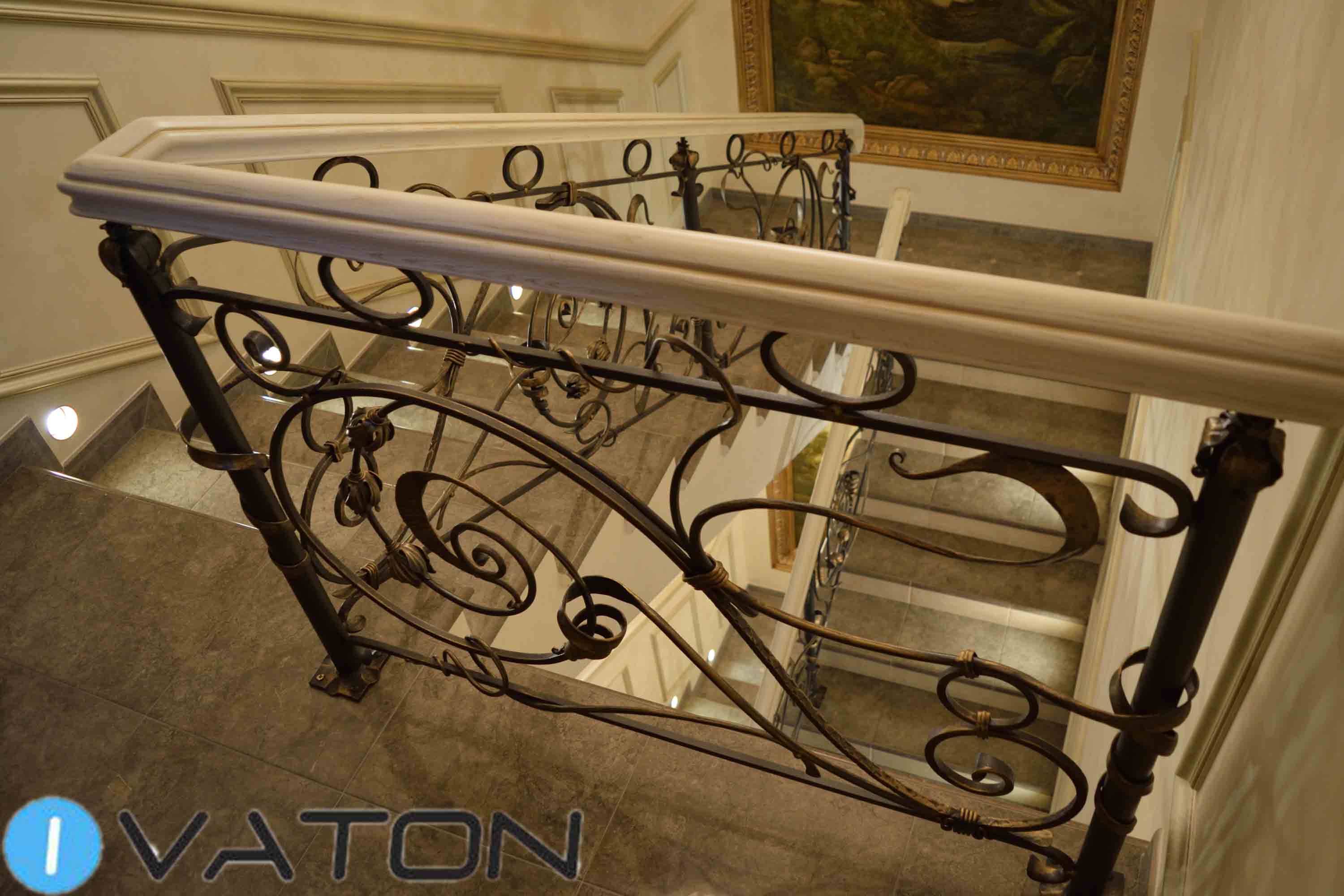 Очень красивое и роскошное ограждение. Здесь достигнуто гармоничное сочетание художественной ковки и поручня из массива дуба, покрашенного эмалью с золотой патиной с закреплением паркетным твердым бесцветным лаком. Достойное завершение этого образа - гнутый поручень и барашки в конце лестничного марша.