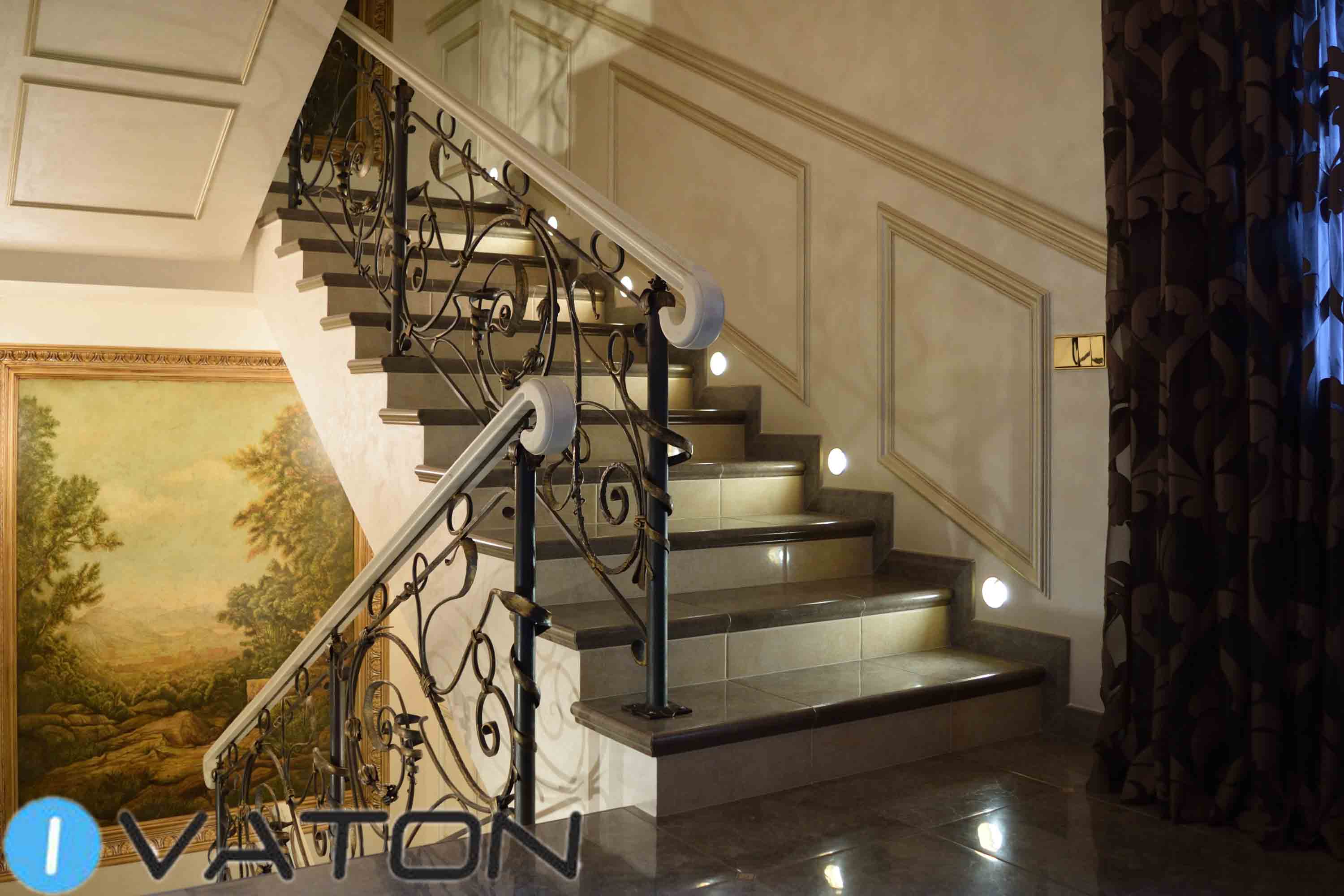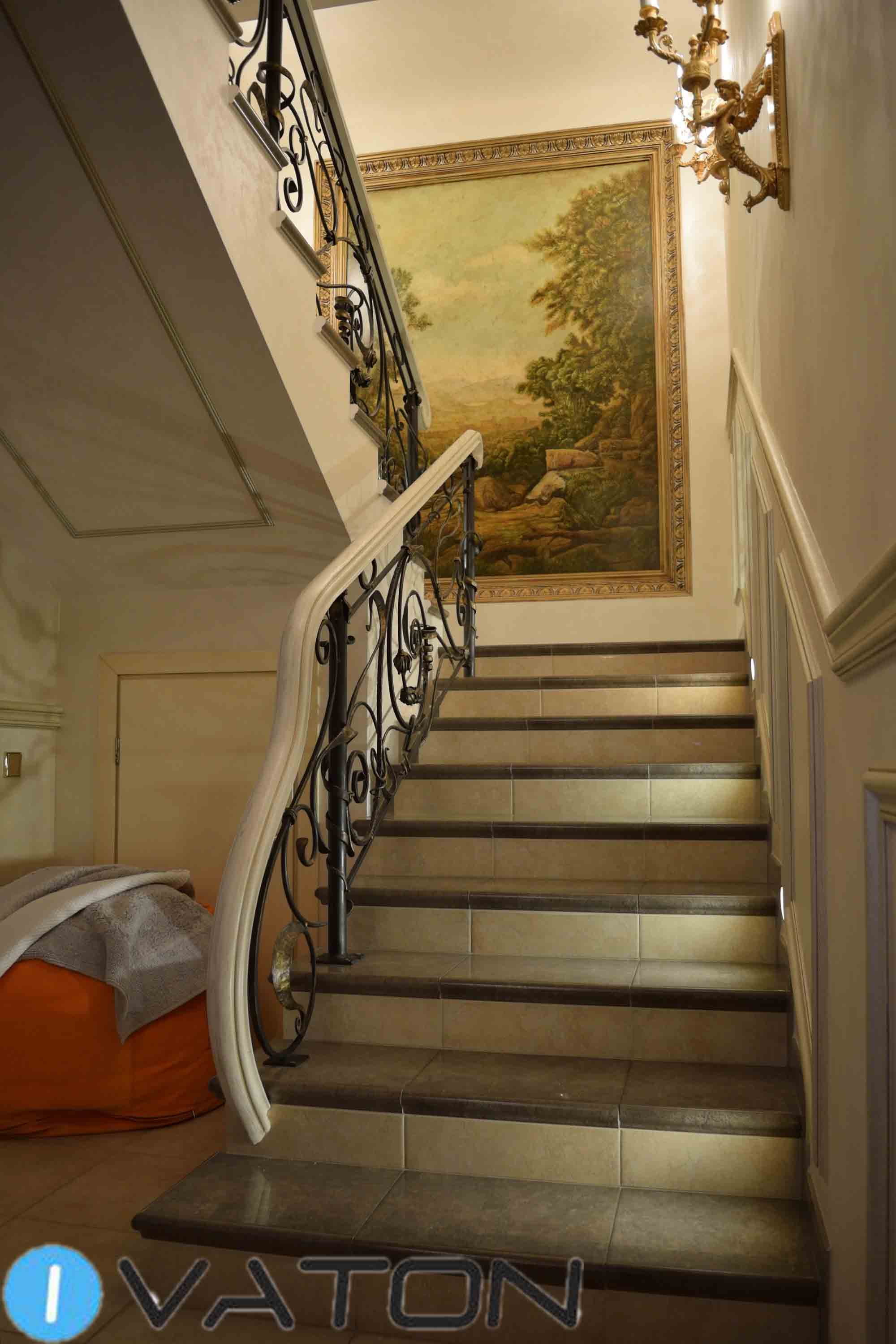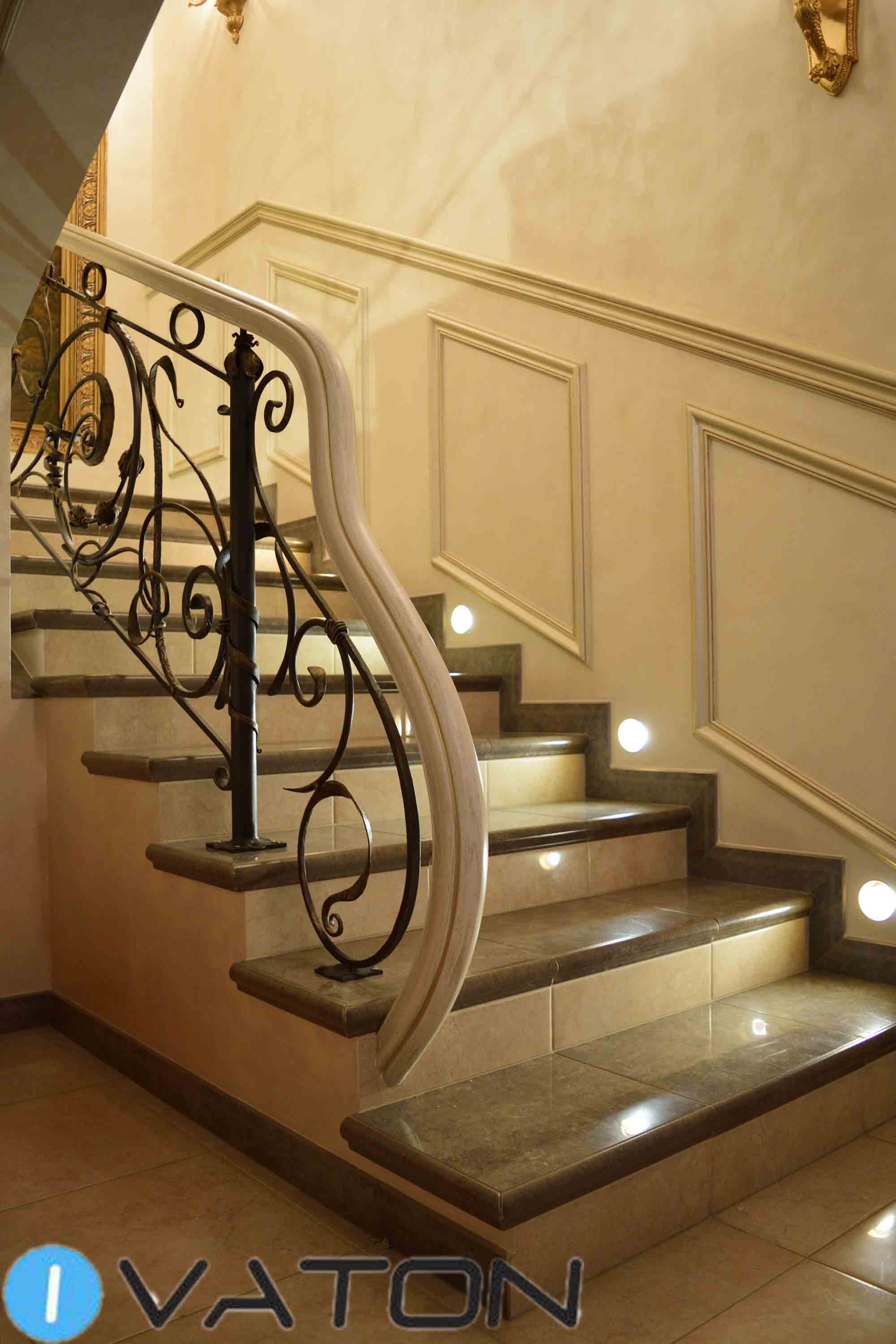 Очень красивое и роскошное ограждение. Здесь достигнуто гармоничное сочетание художественной ковки и поручня из массива дуба, покрашенного эмалью с золотой патиной с закреплением паркетным твердым бесцветным лаком. Достойное завершение этого образа - гнутый поручень и барашки в конце лестничного марша.