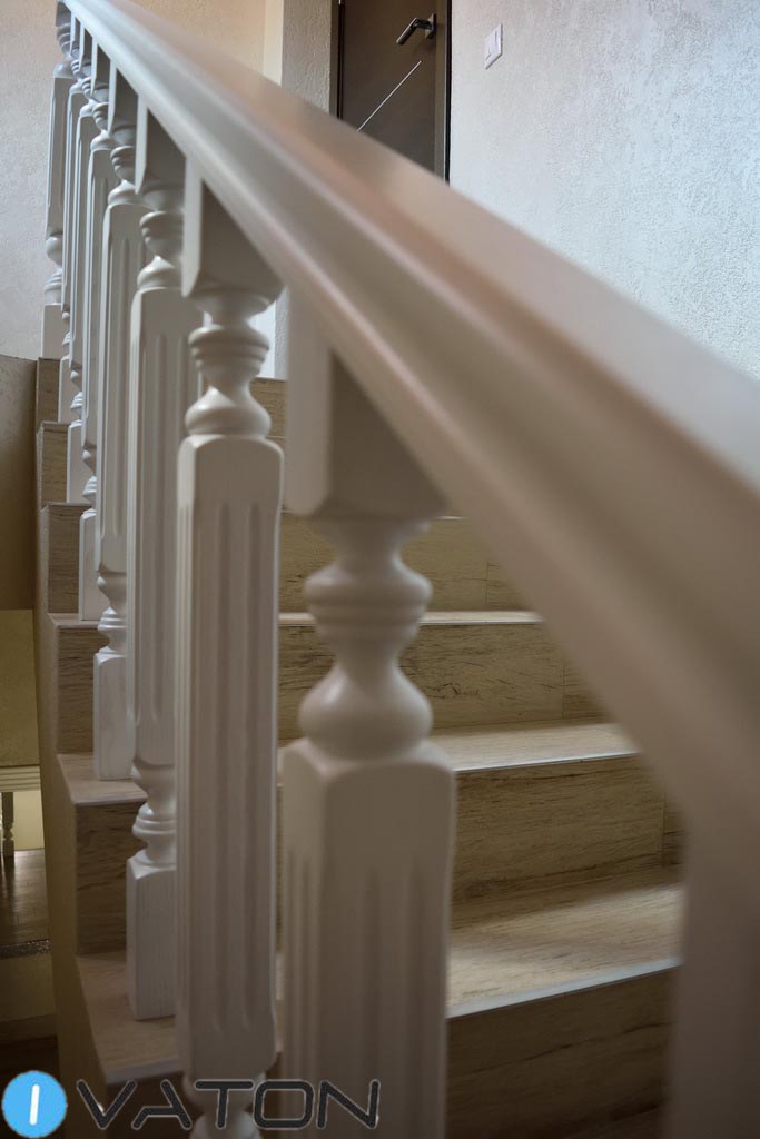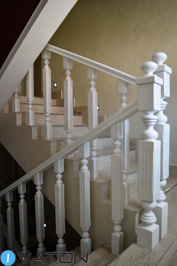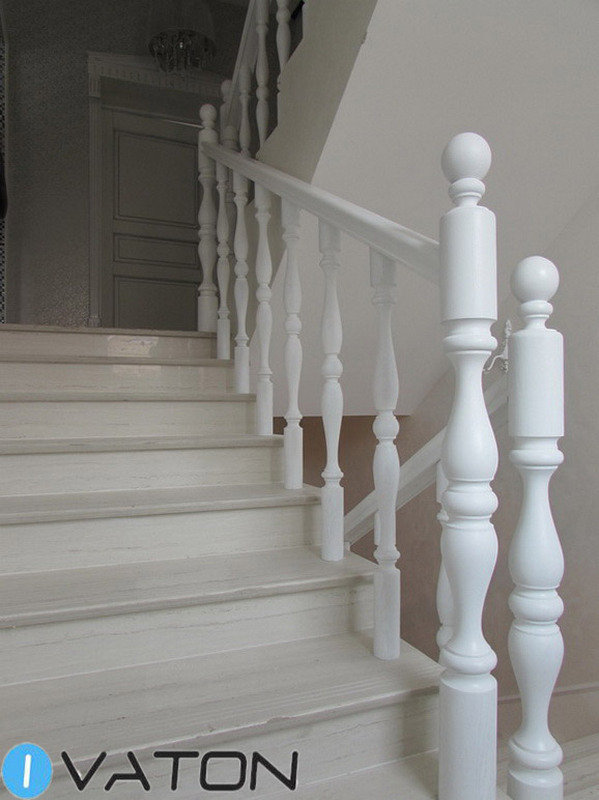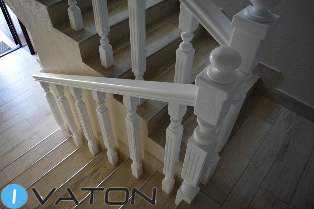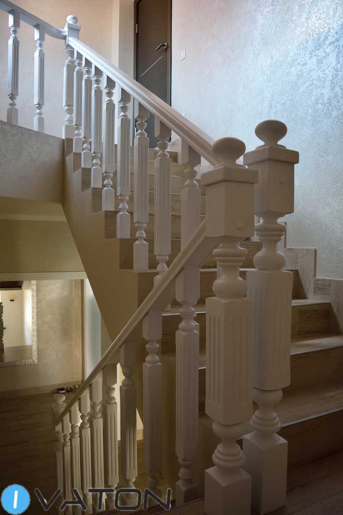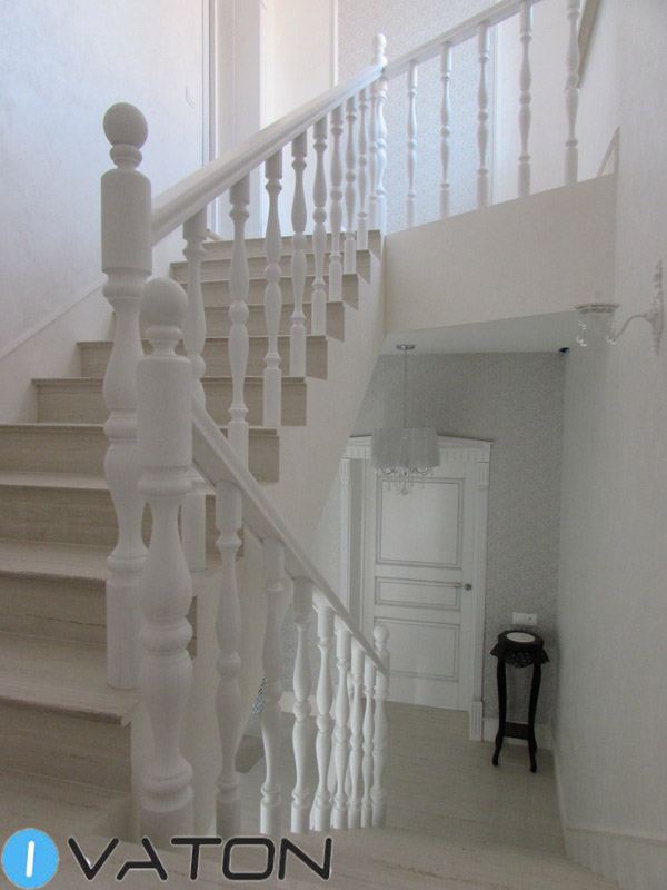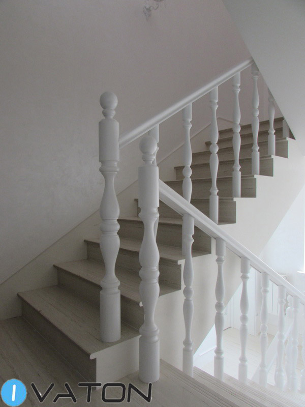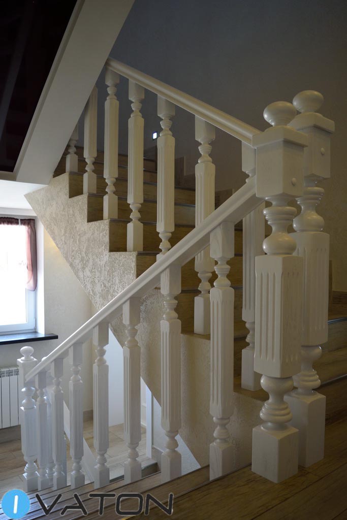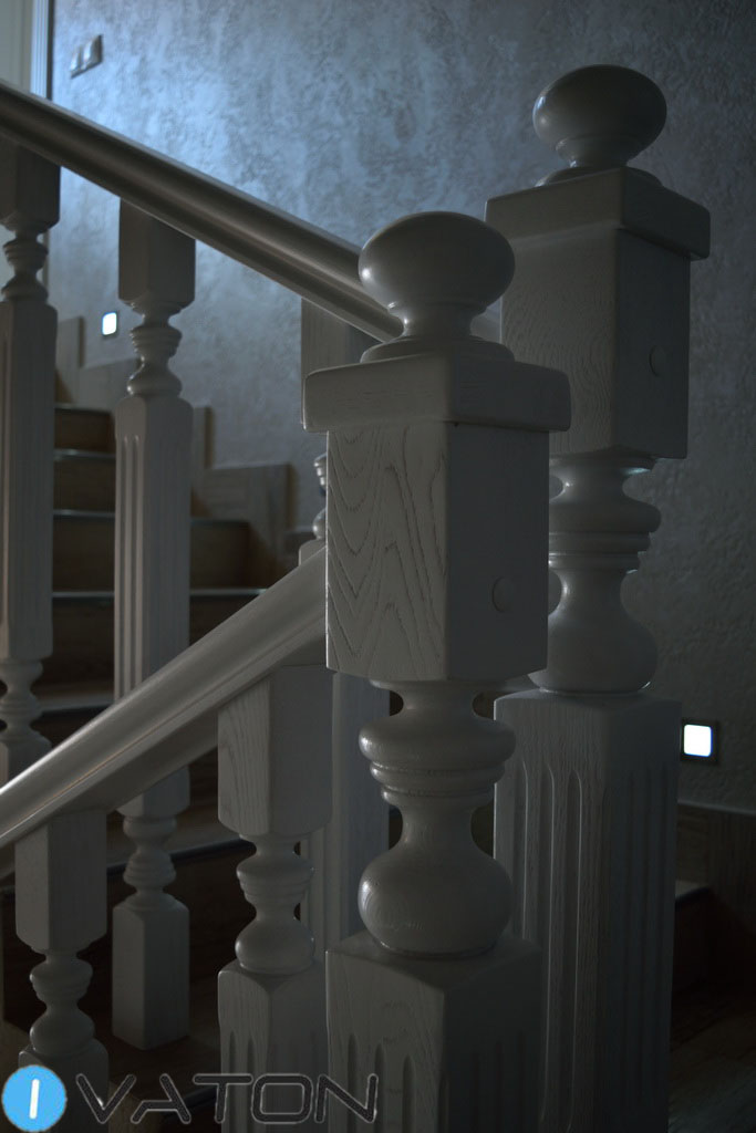Это классическое ограждение из массива дуба бетонной лестницы в таун-хаусе.Здесь использованы массивные точеные столбы и балясины с продольными фрезеровками.Покраска белой эмалью с паркетным лаком.