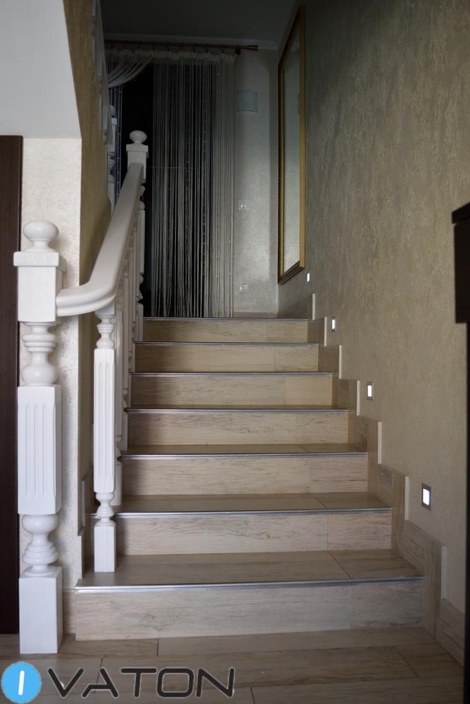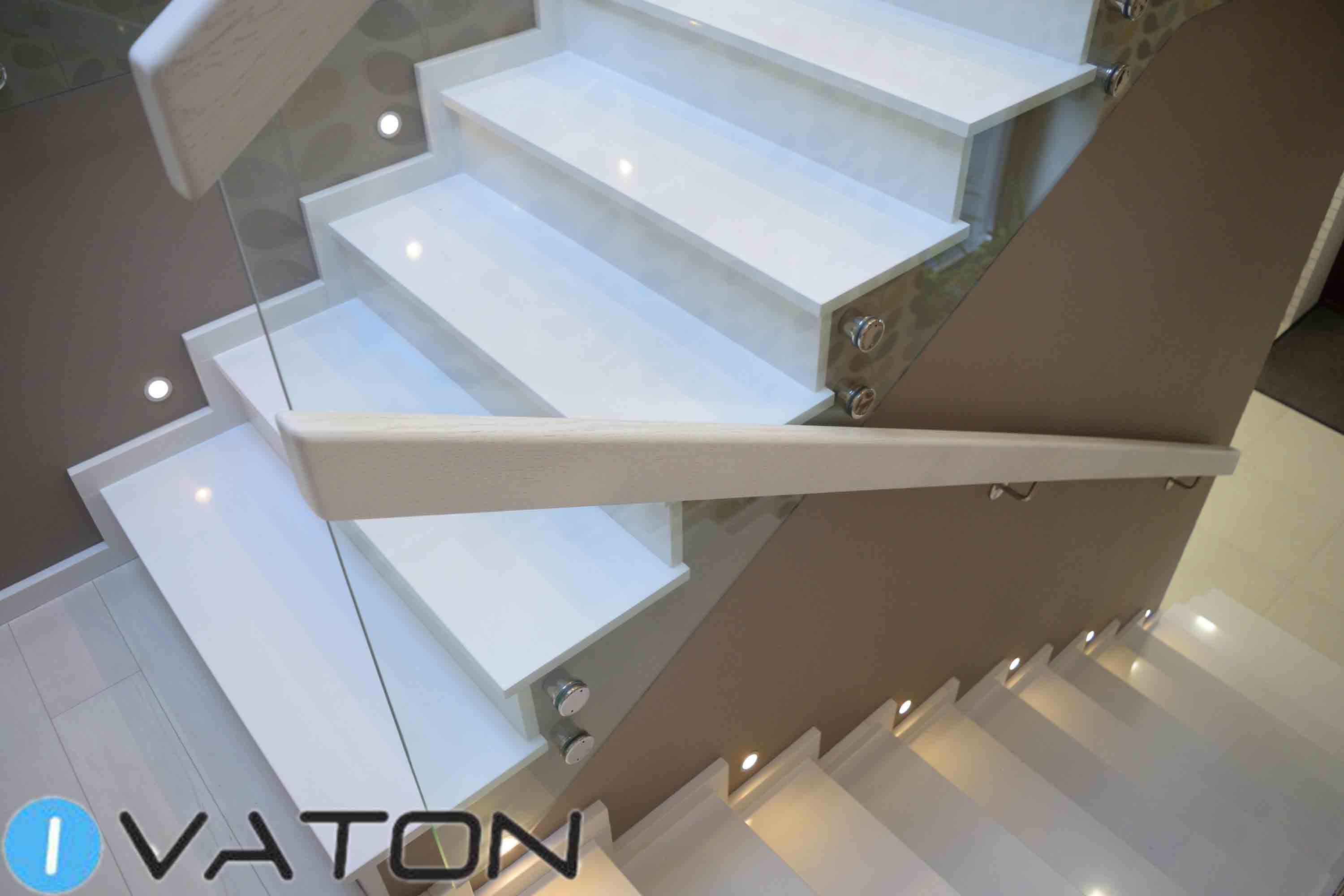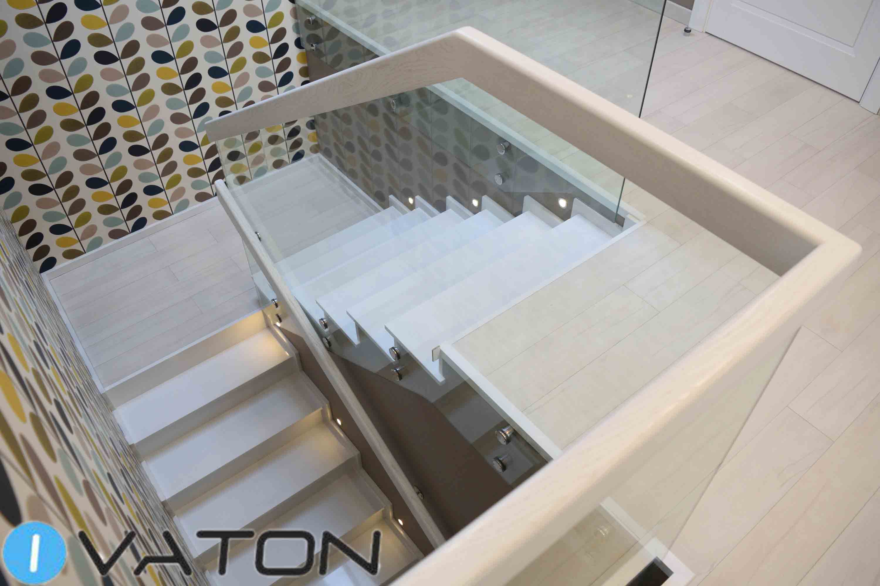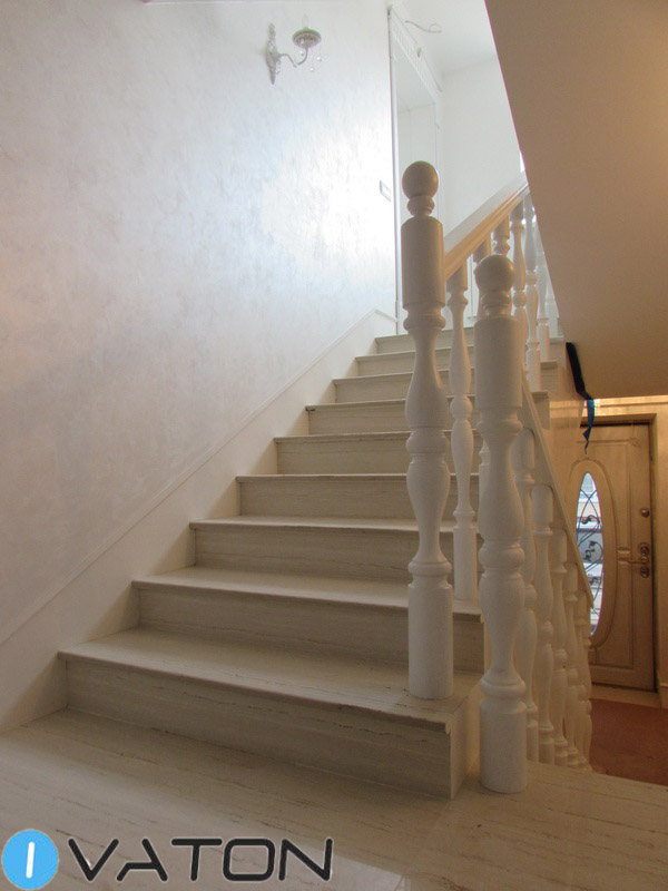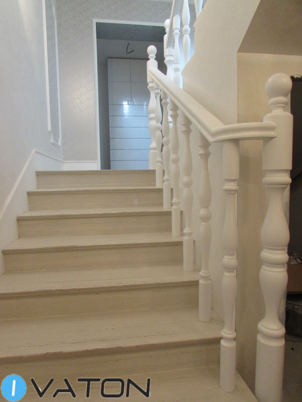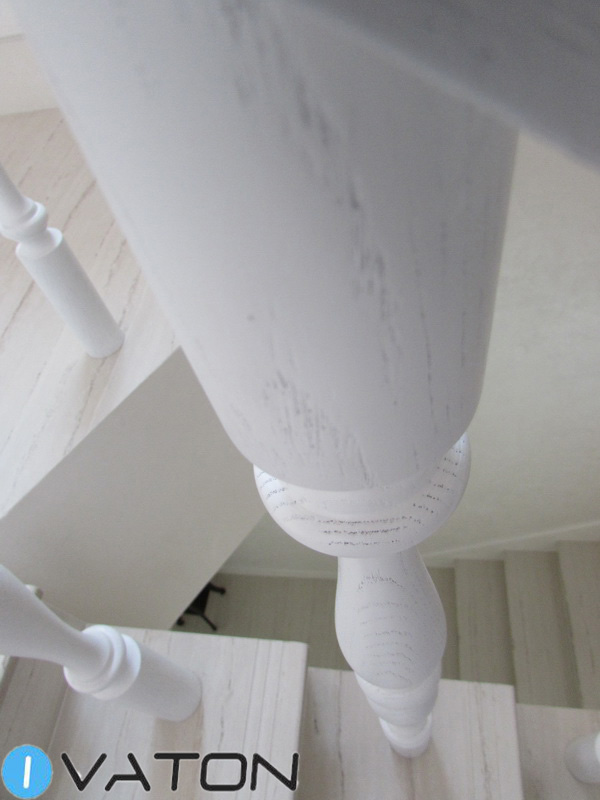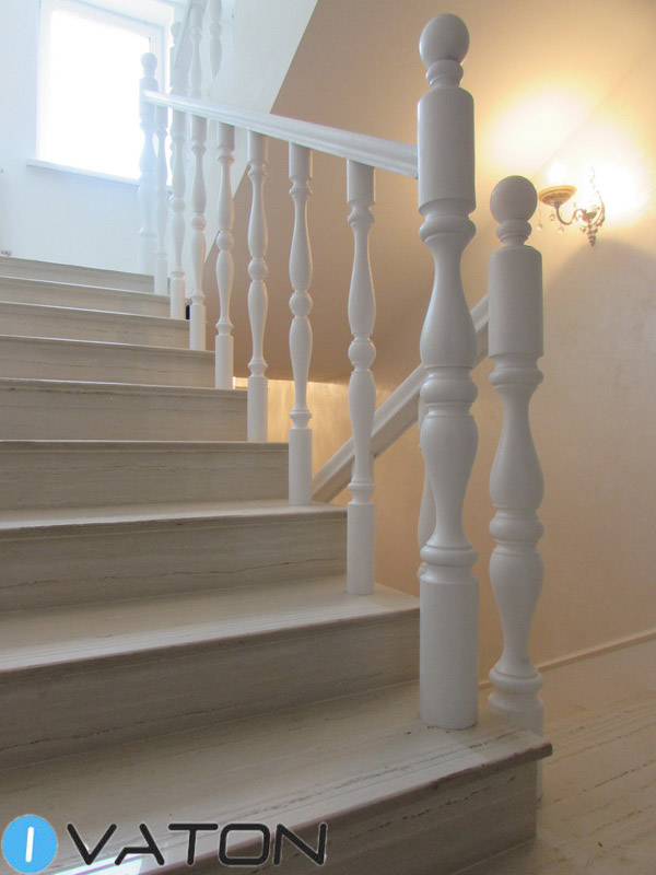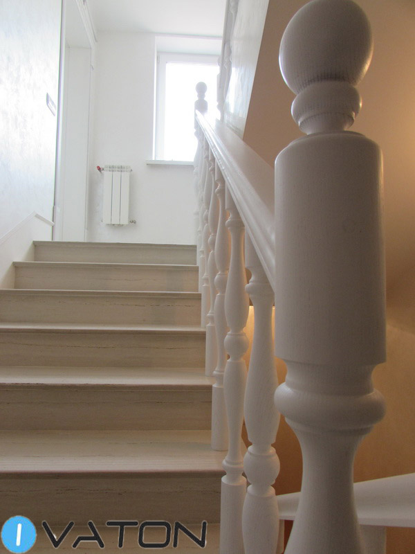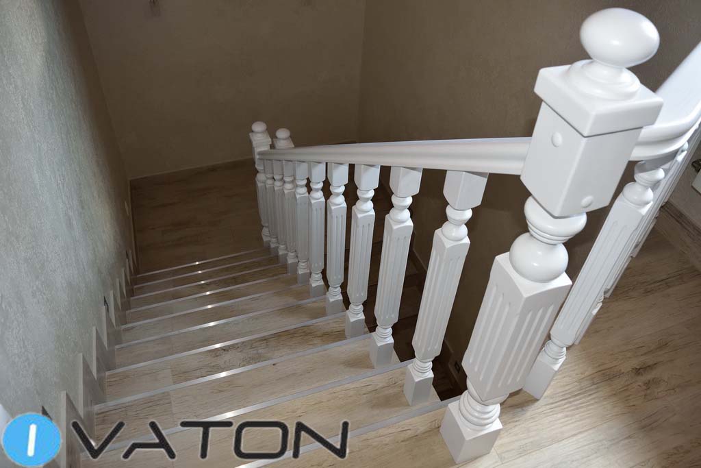 Это классическое ограждение из массива дуба бетонной лестницы в таун-хаусе.Здесь использованы массивные точеные столбы и балясины с продольными фрезеровками.Покраска белой эмалью с паркетным лаком.