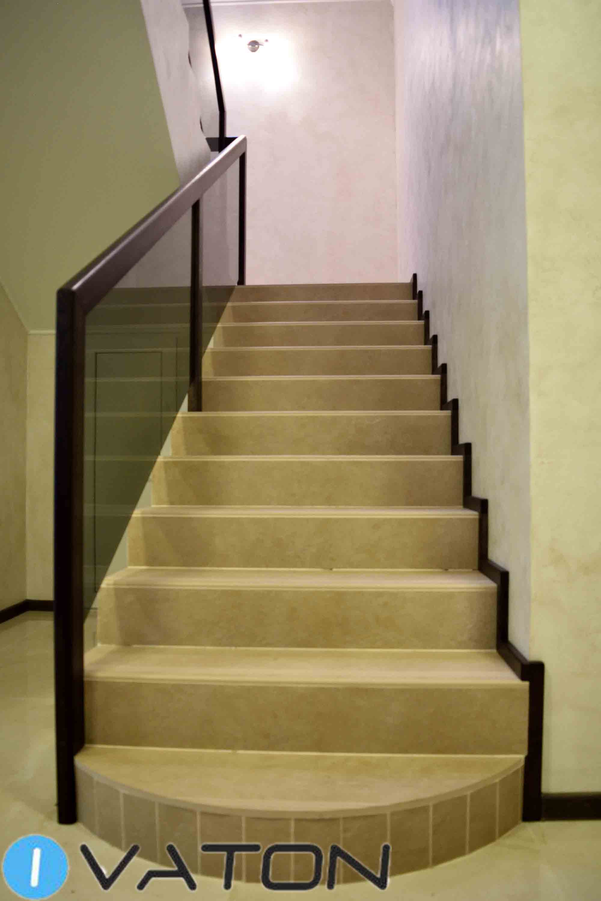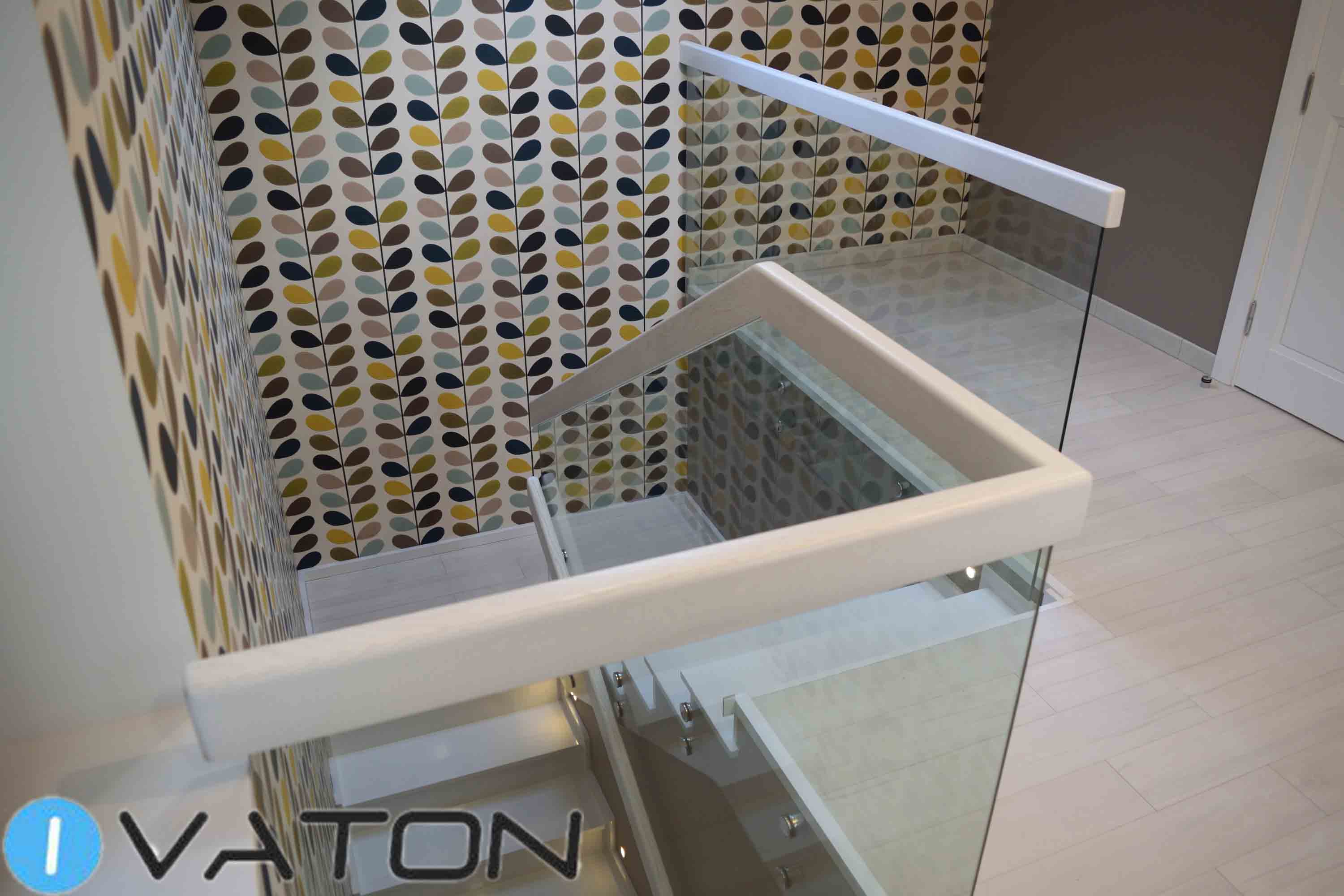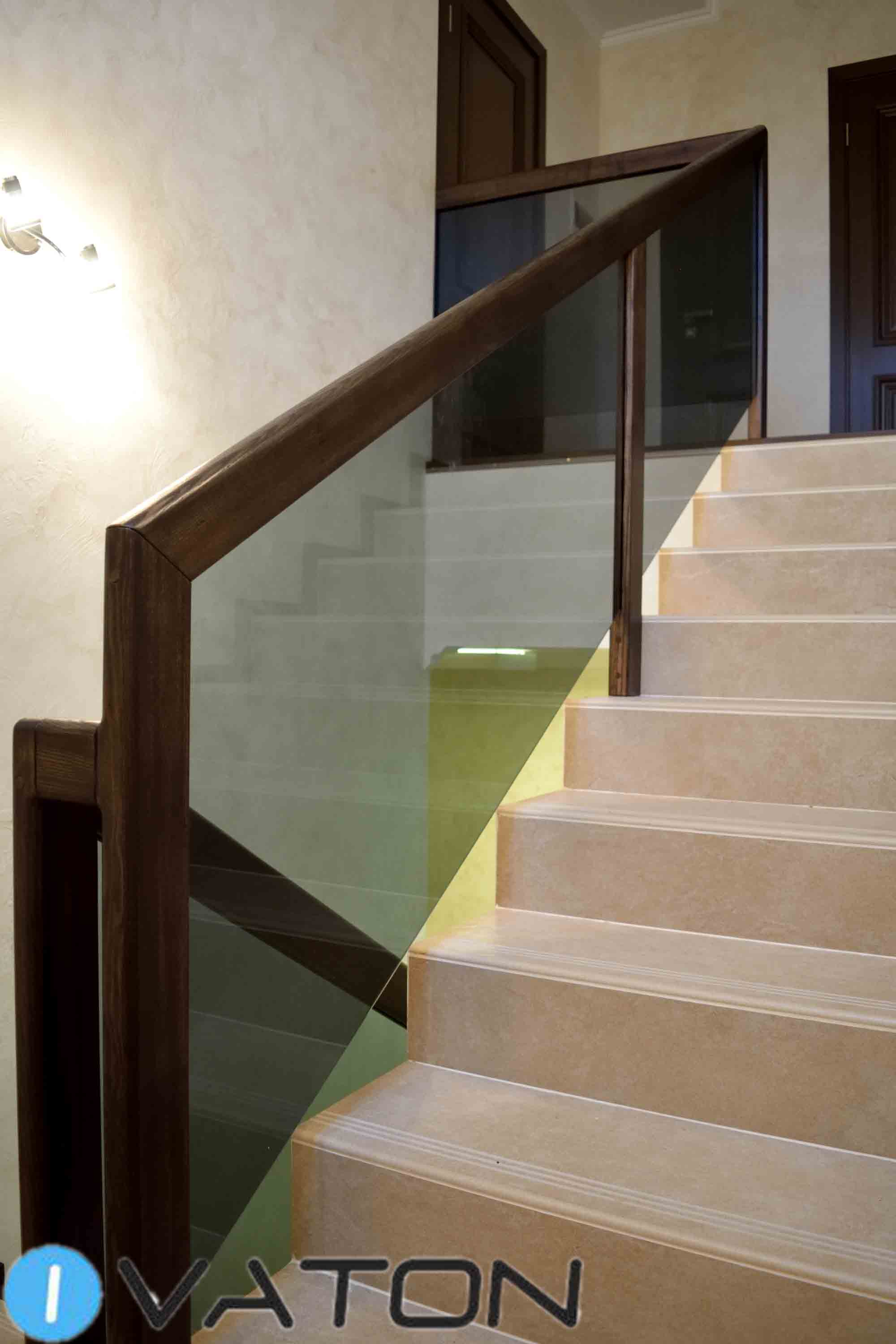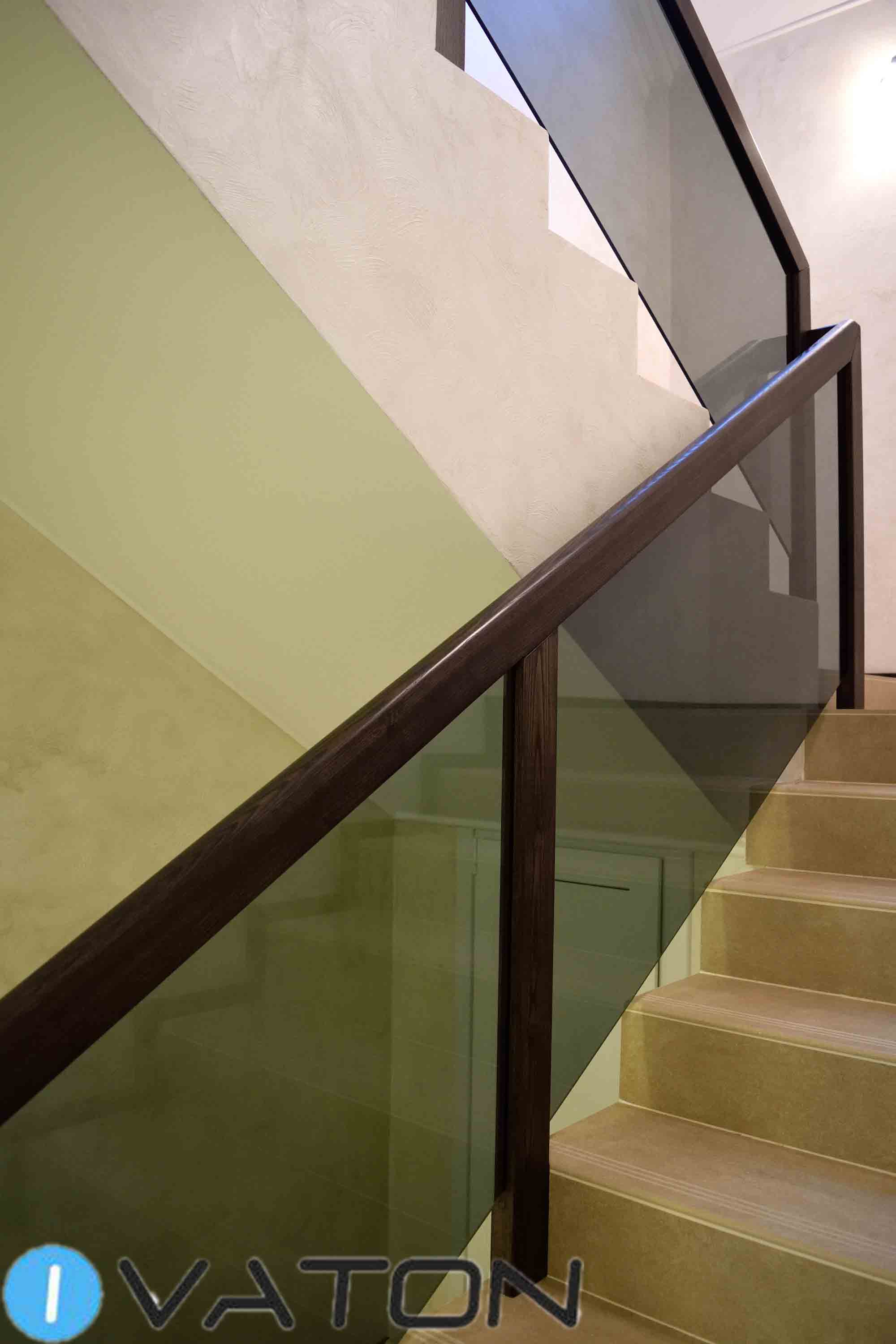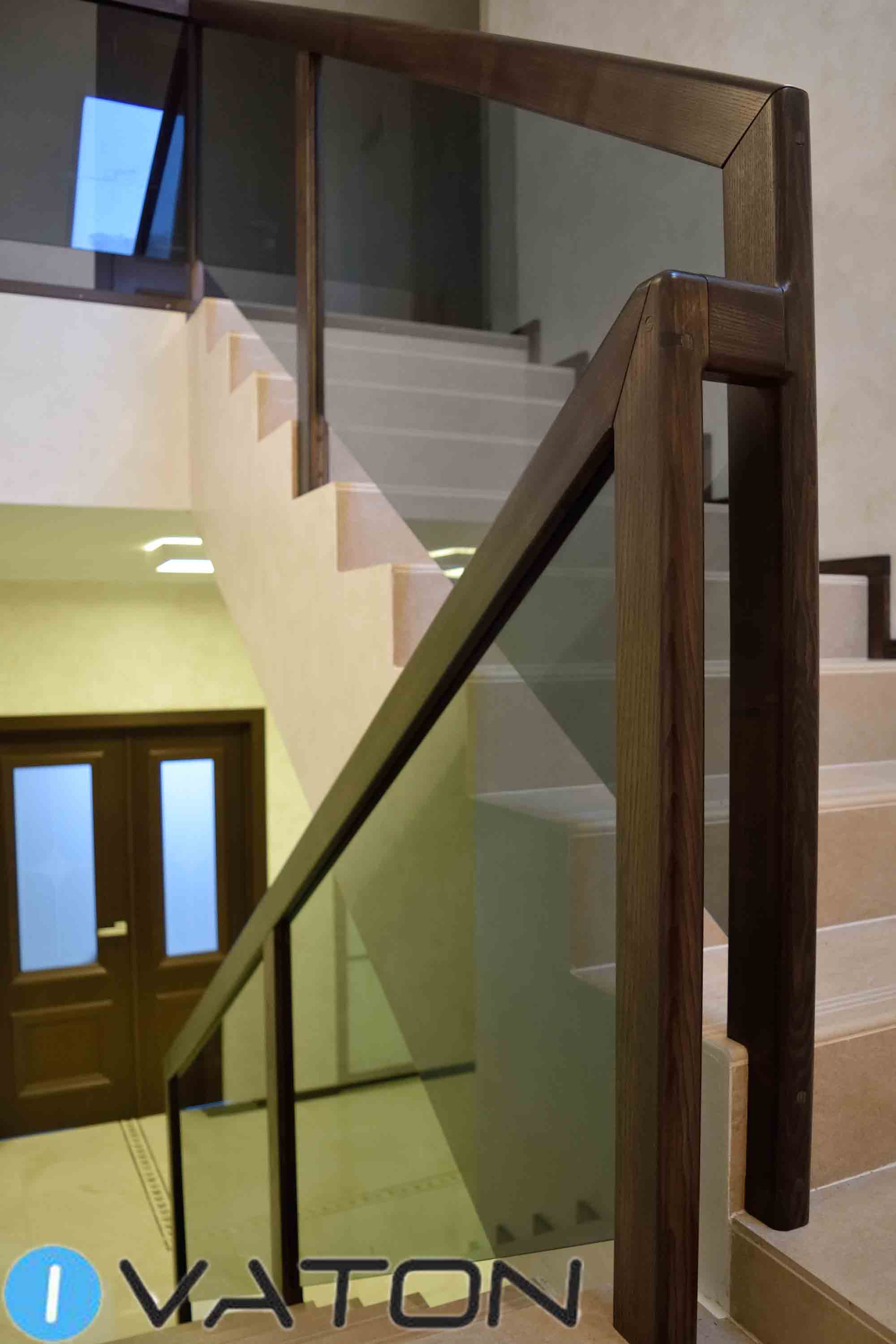 Ограждение из тонированного в цвет граффит каленого стекла,Прямоугольный поручень и стойки из тонированного массива ясеня.