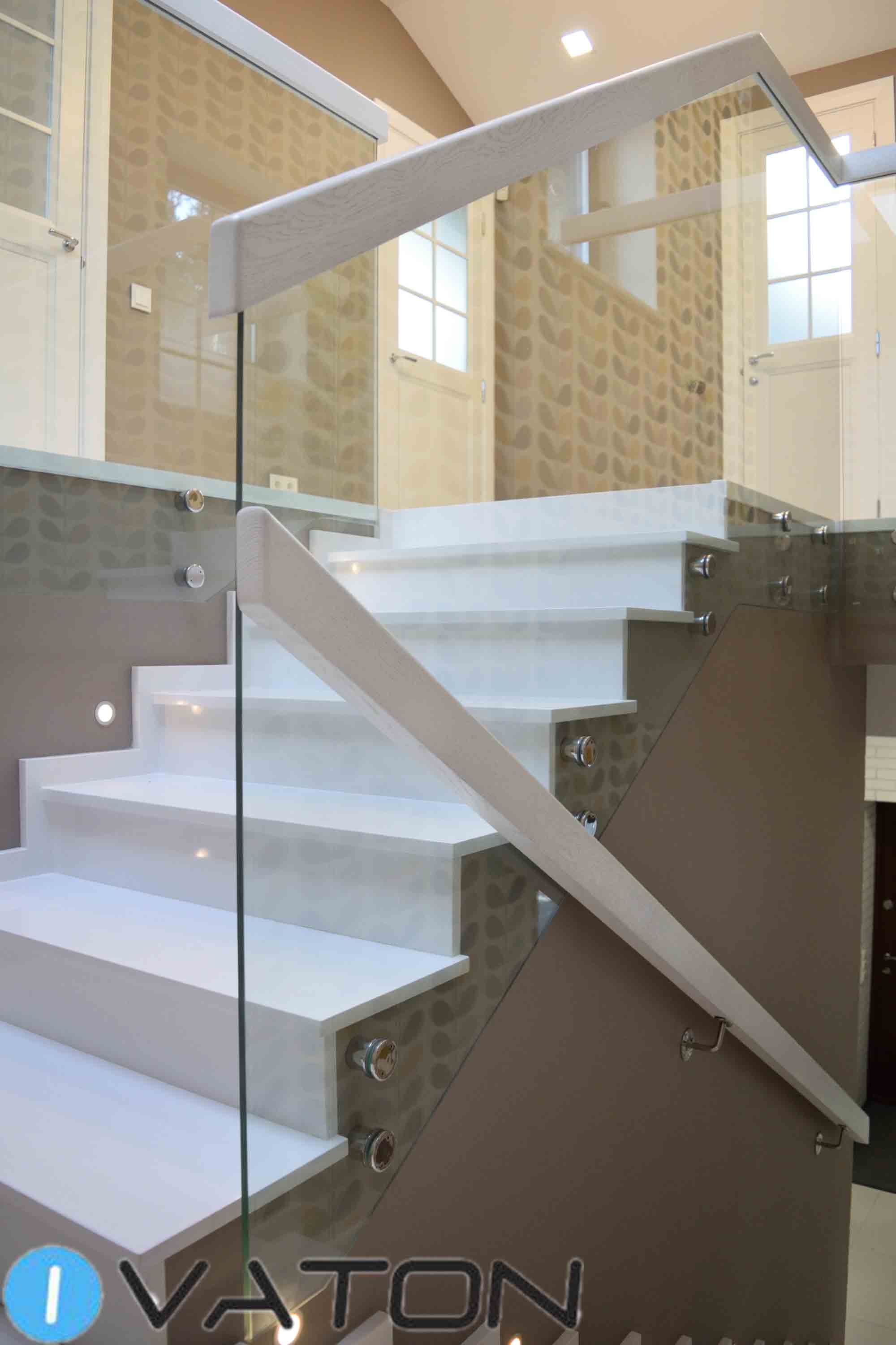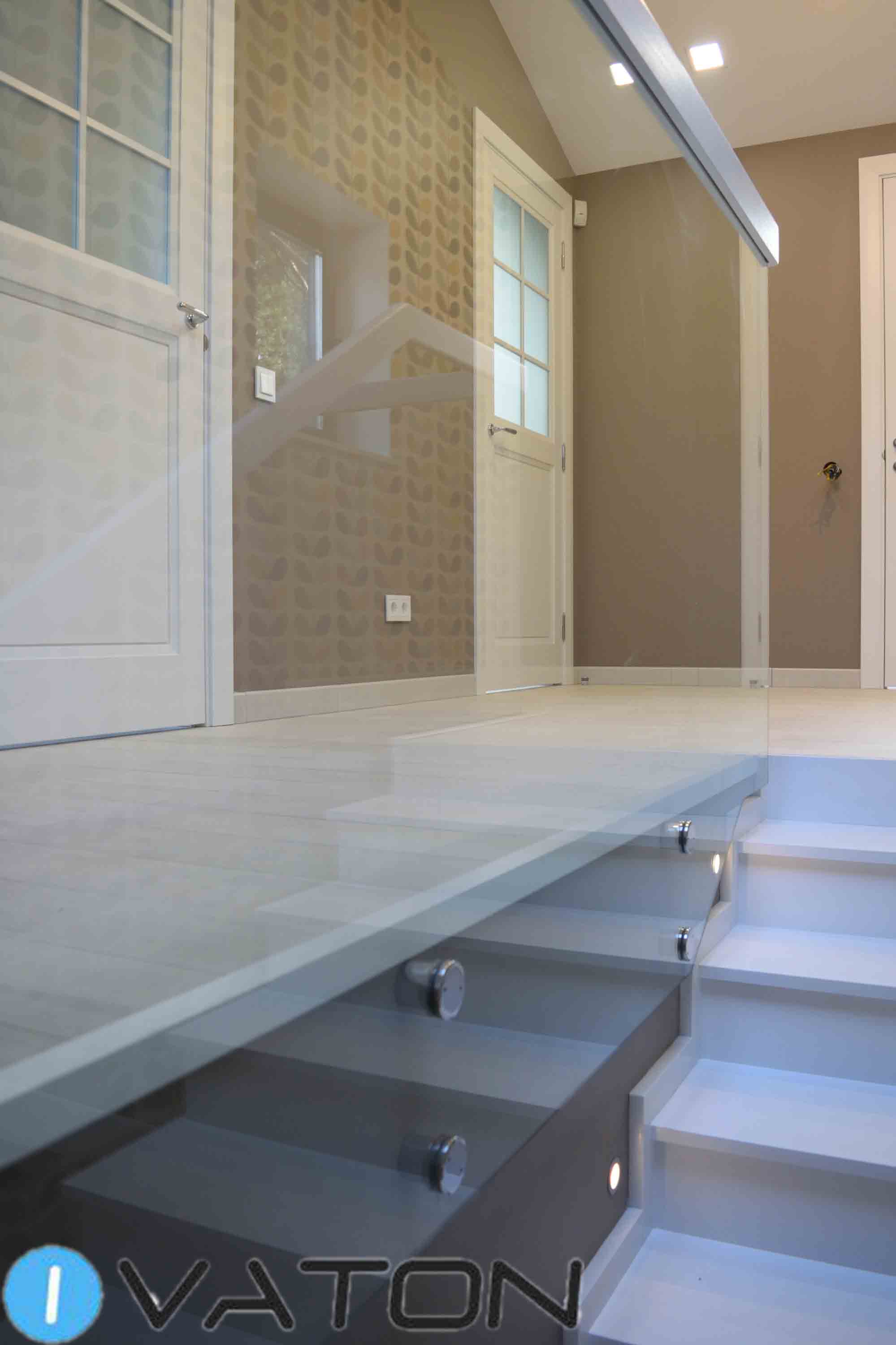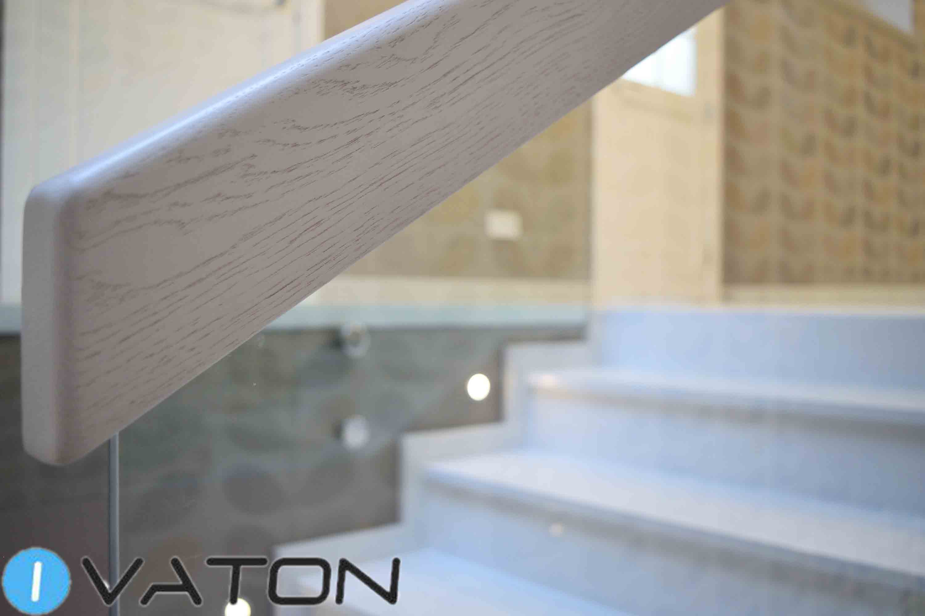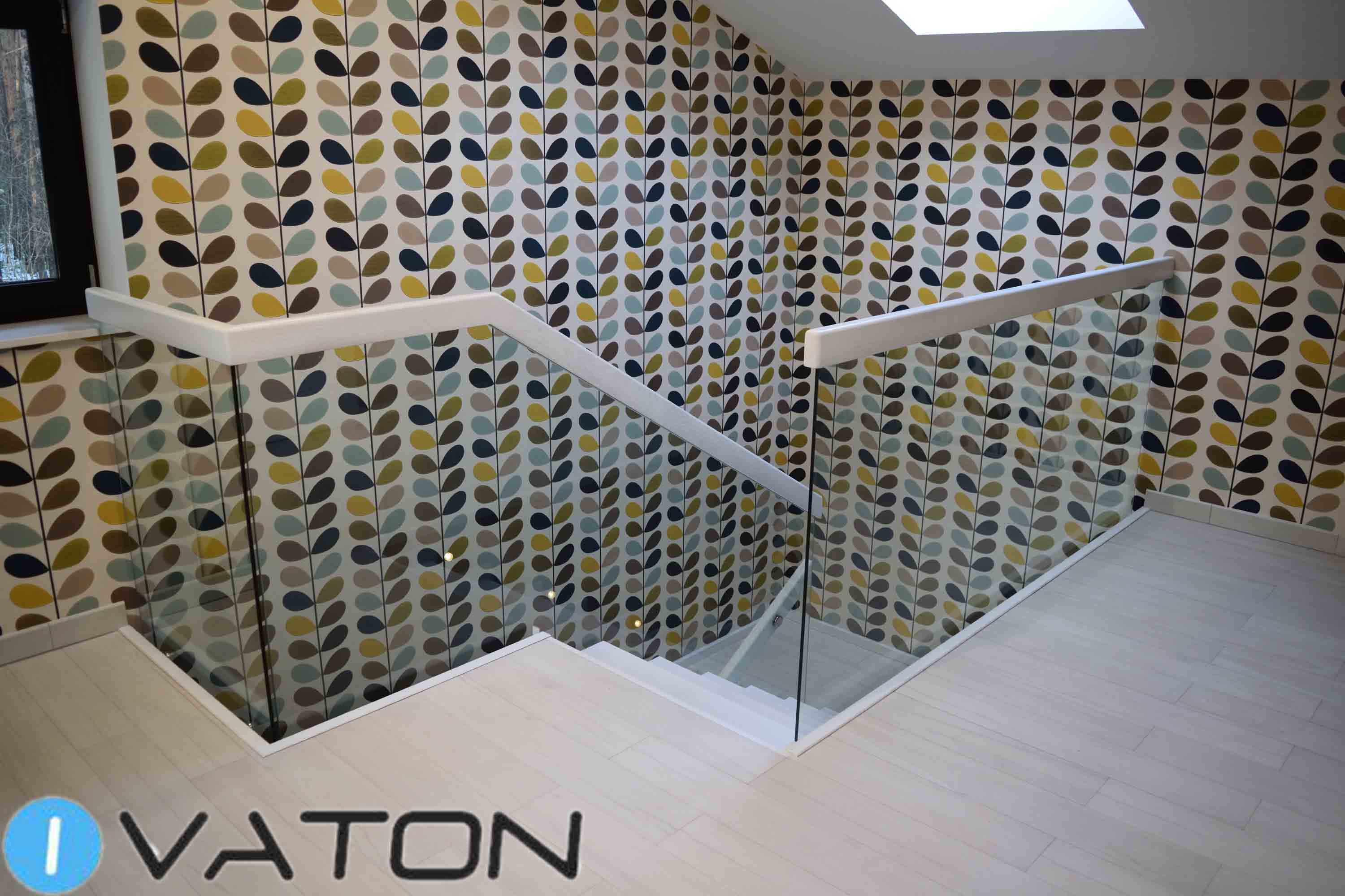 В этом ограждении использовано закаленное стекло толщиной 10мм., с боковым креплением с помощью специальных кронштейнов из нержавеющей стали. Сверху - светлый прямоугольный поручень из массива дуба, под бесветным паркетным лаком. Интересный момент - крепление пристенного поручня на кронштейнах из нержавеющей стали.