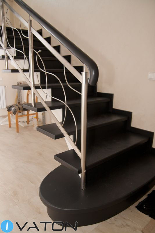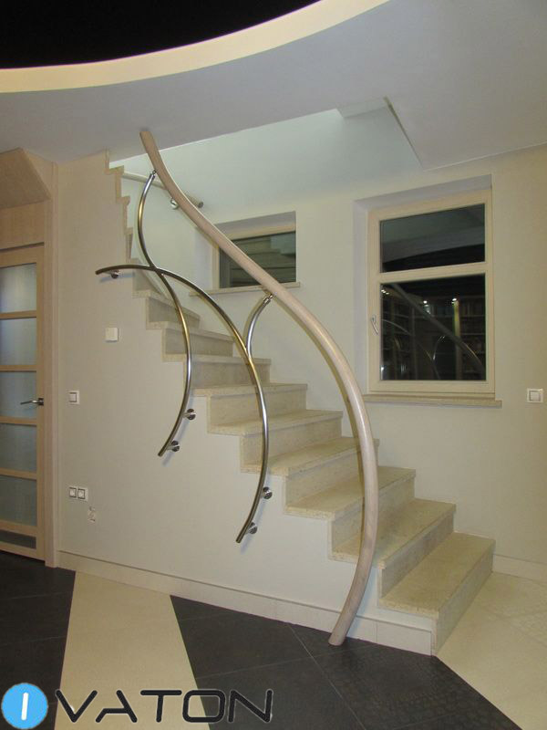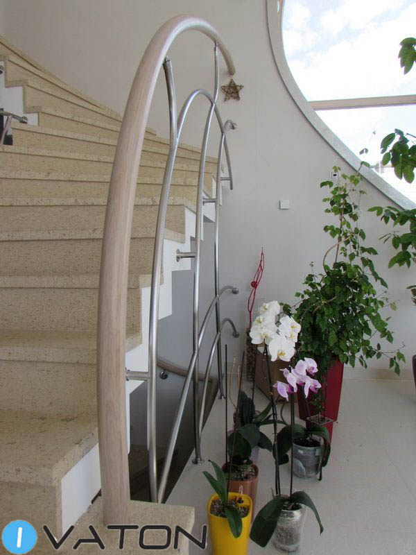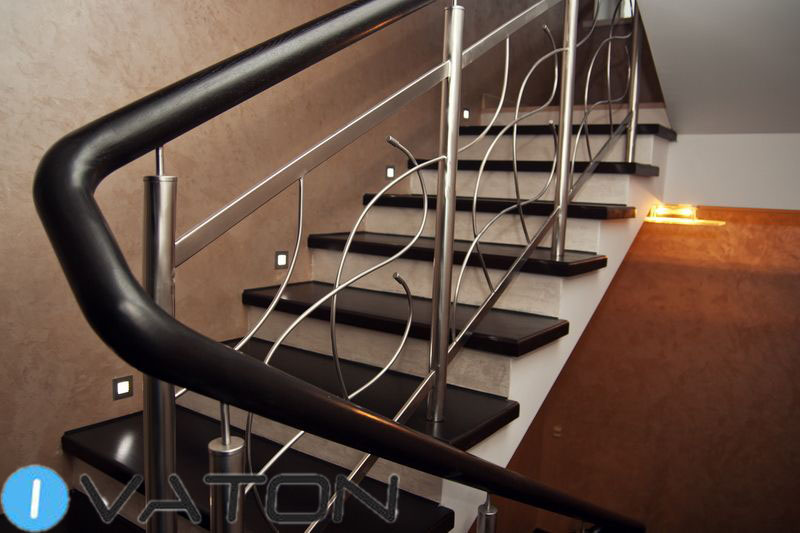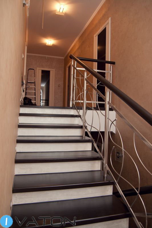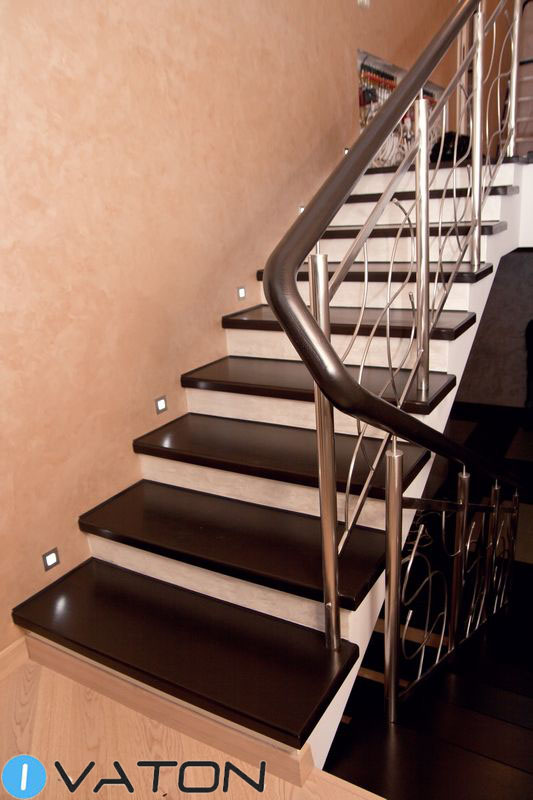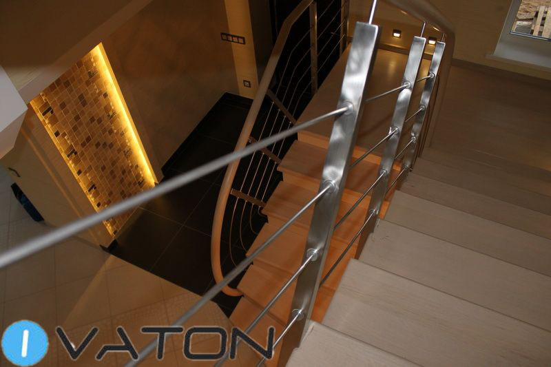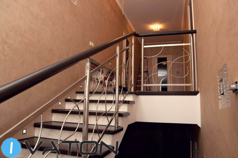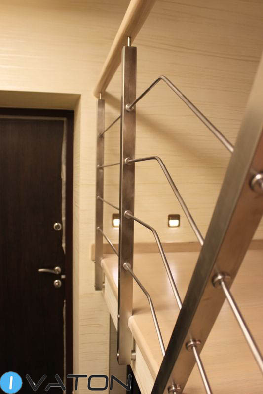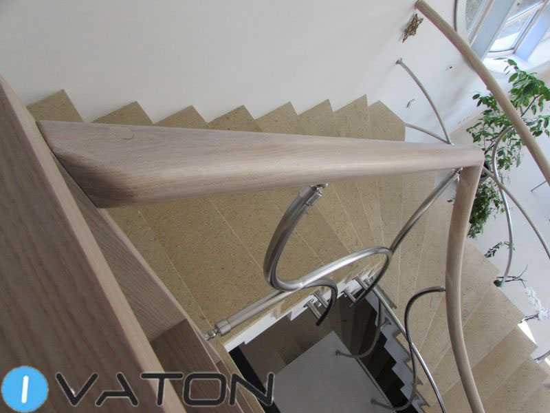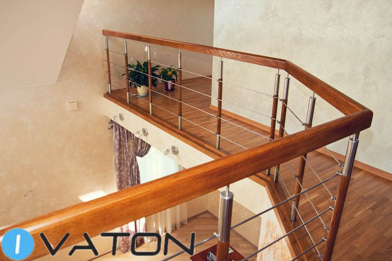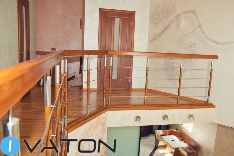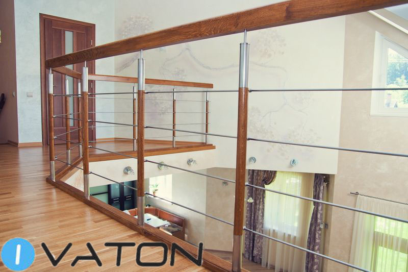 В ограждении сочетание комбинированных стоек из тонированного дуба и нержавеющей стали, поручень – дубовый, прямоугольный, фрезерованный.