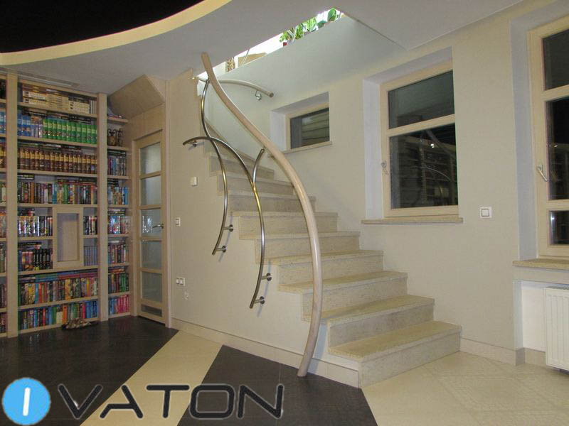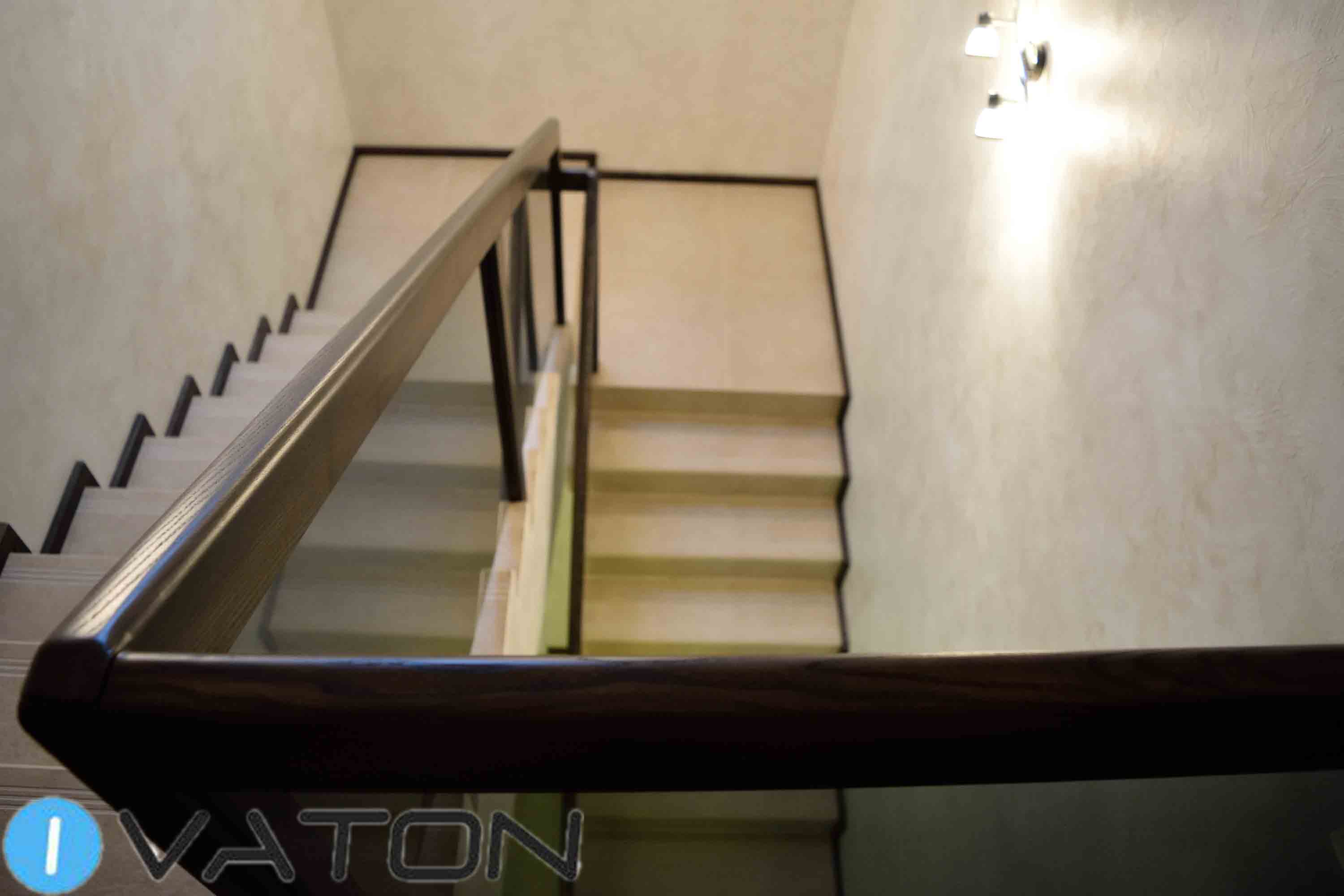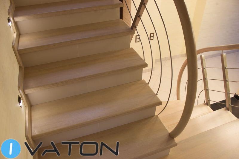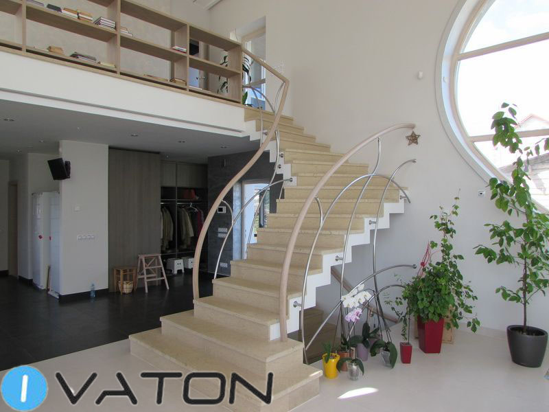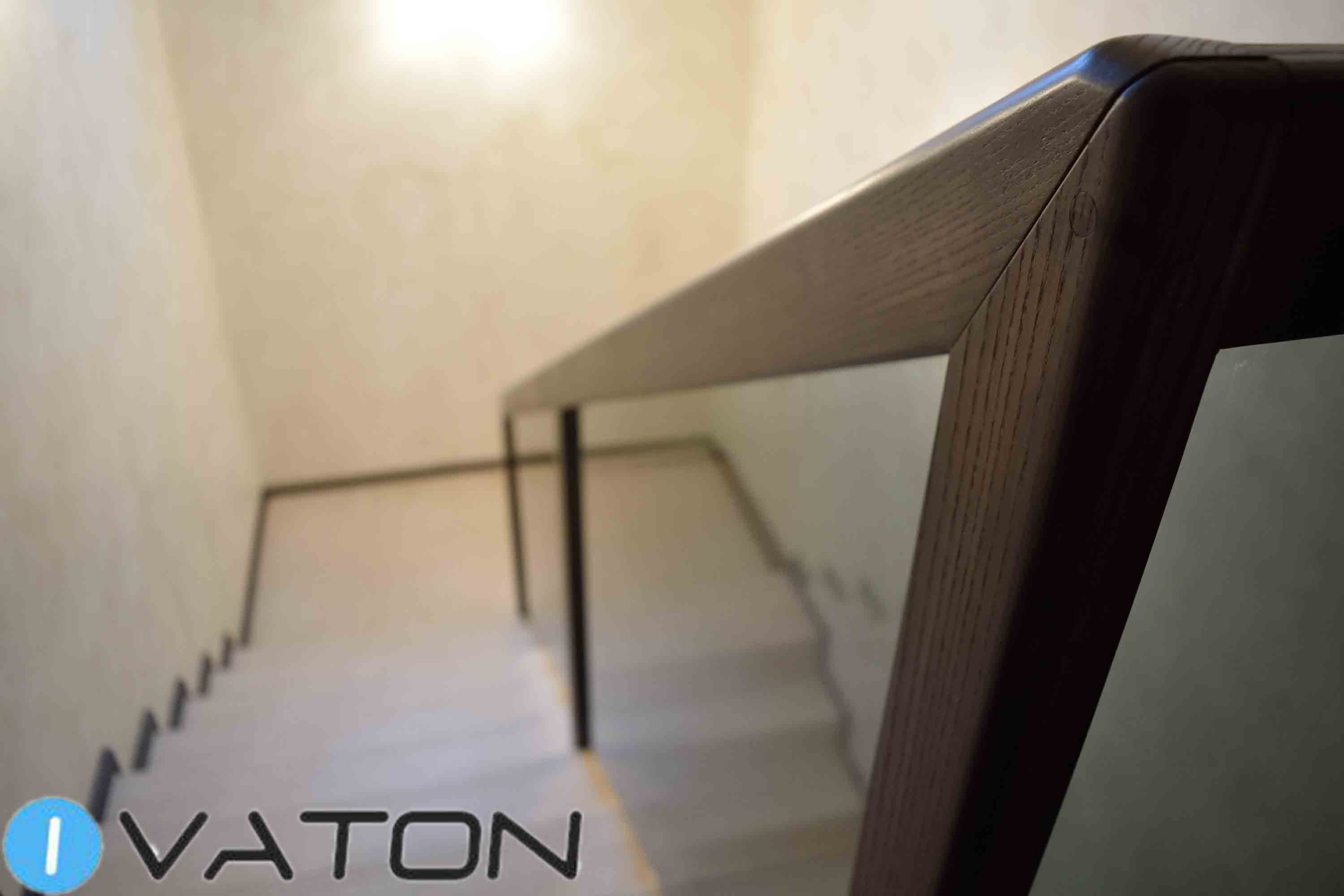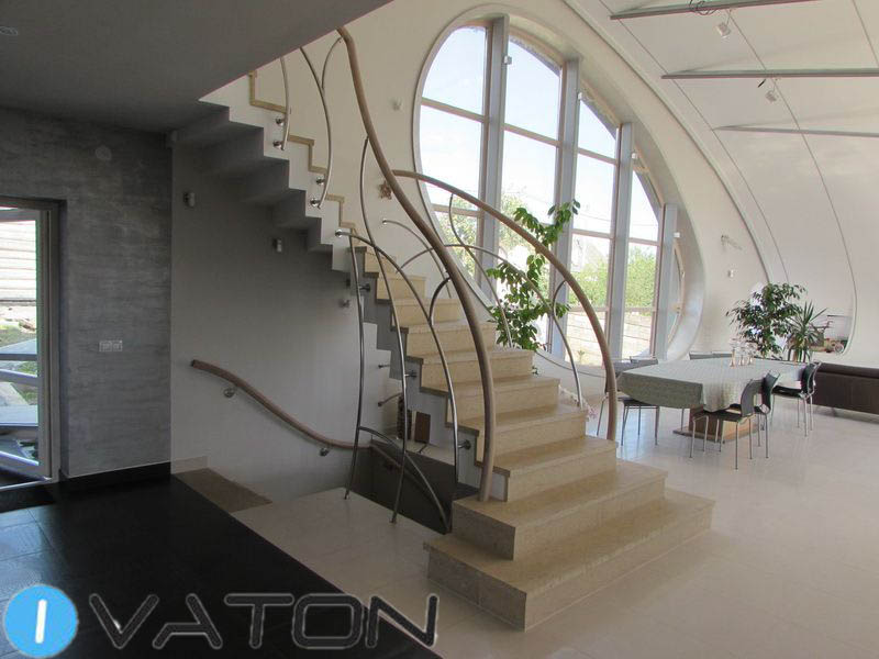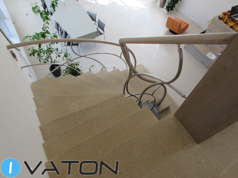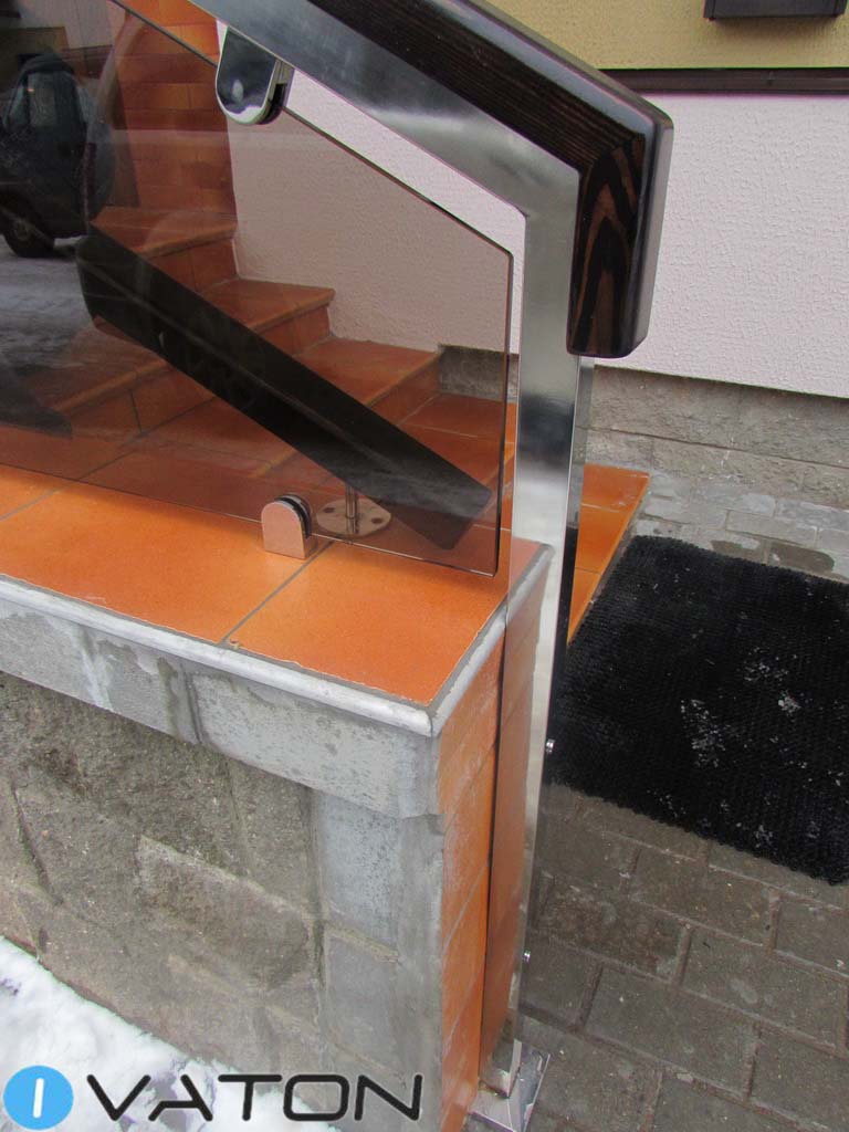 В ограждении сочетание комбинированных стоек из тонированного дуба и нержавеющей стали, поручень – дубовый, прямоугольный, фрезерованный.