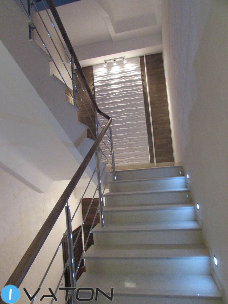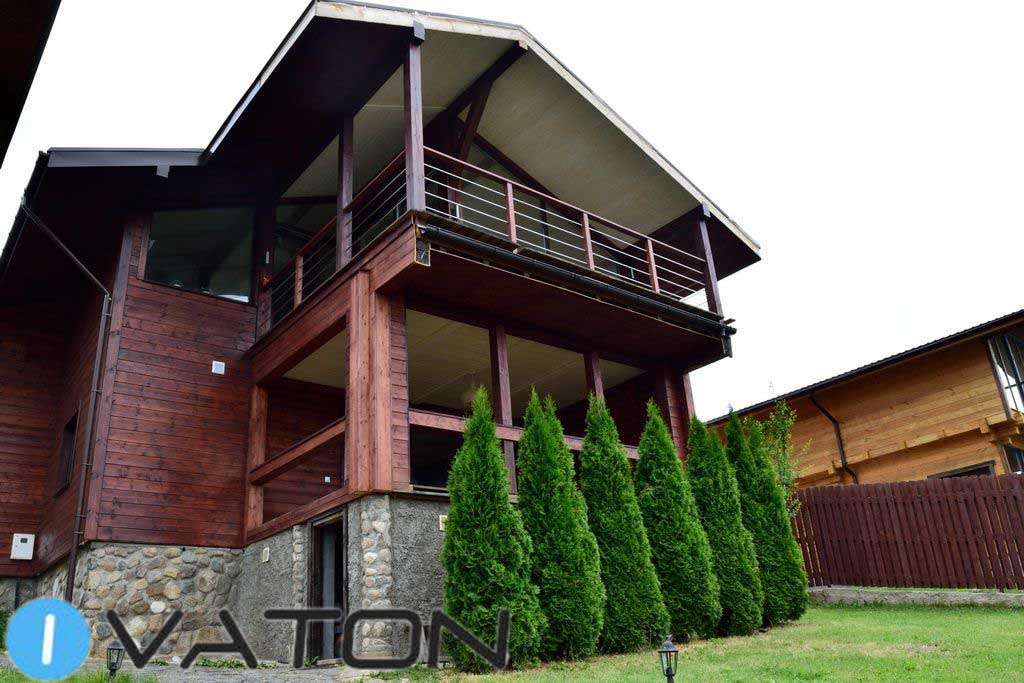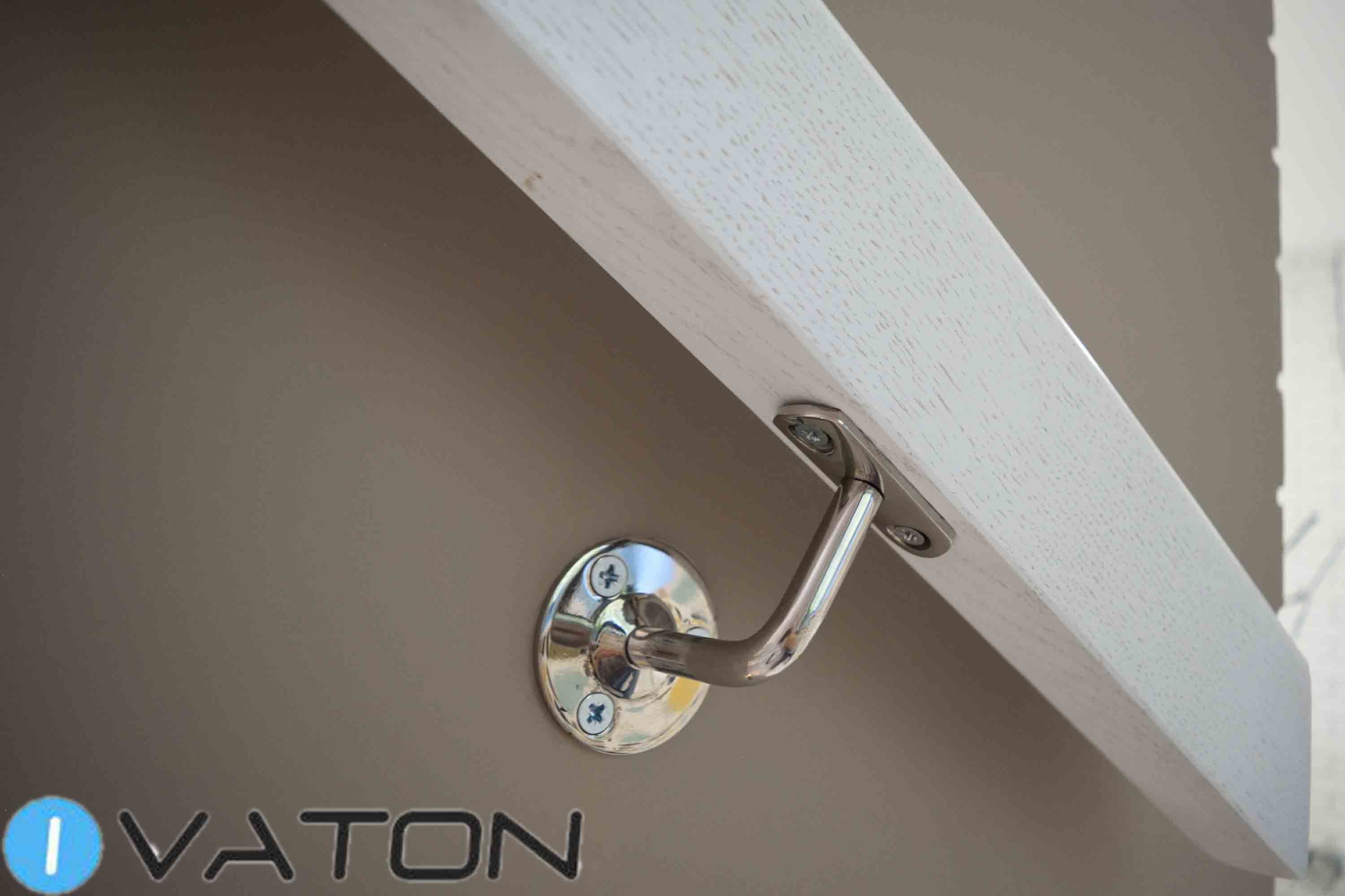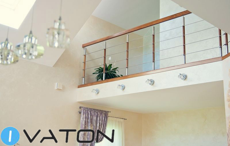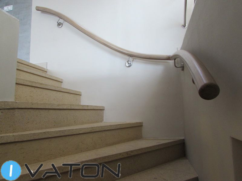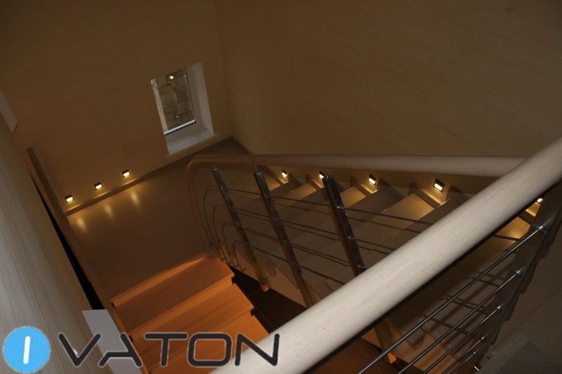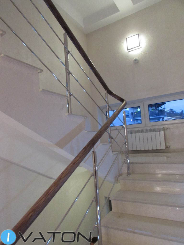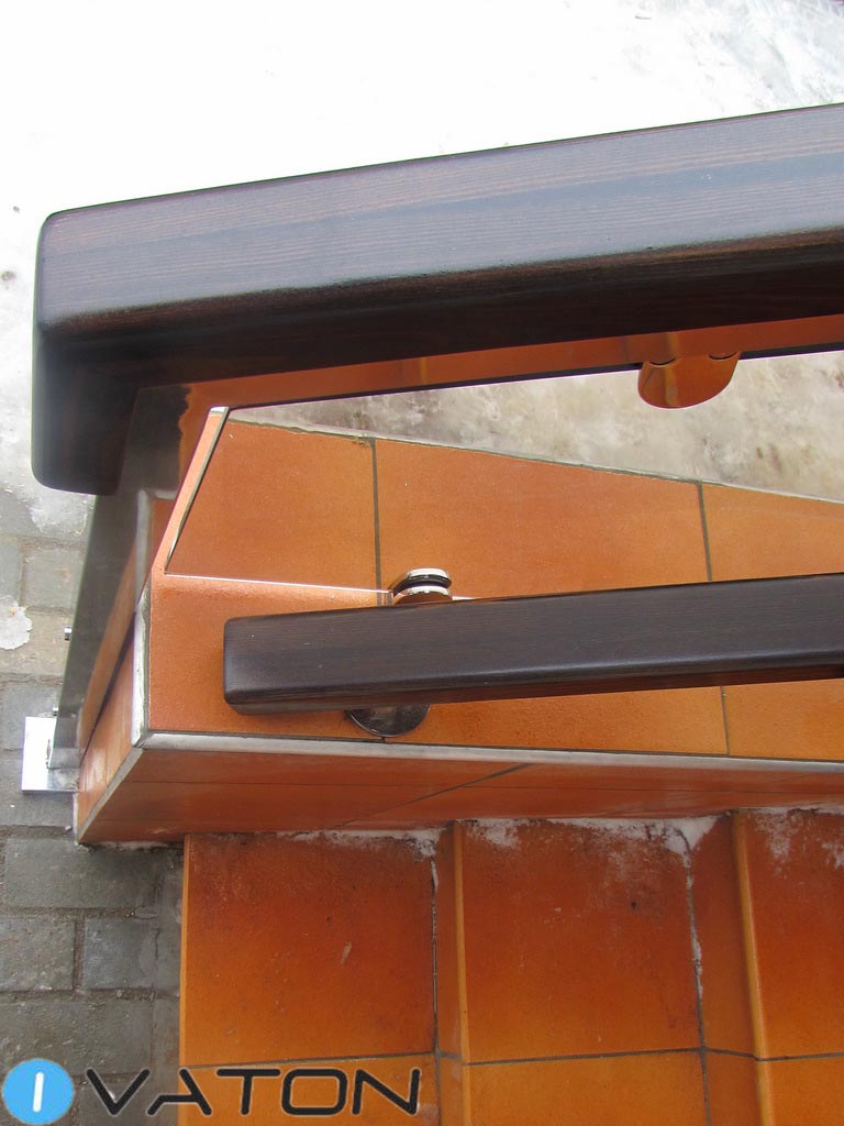 В ограждении сочетание комбинированных стоек из тонированного дуба и нержавеющей стали, поручень – дубовый, прямоугольный, фрезерованный.