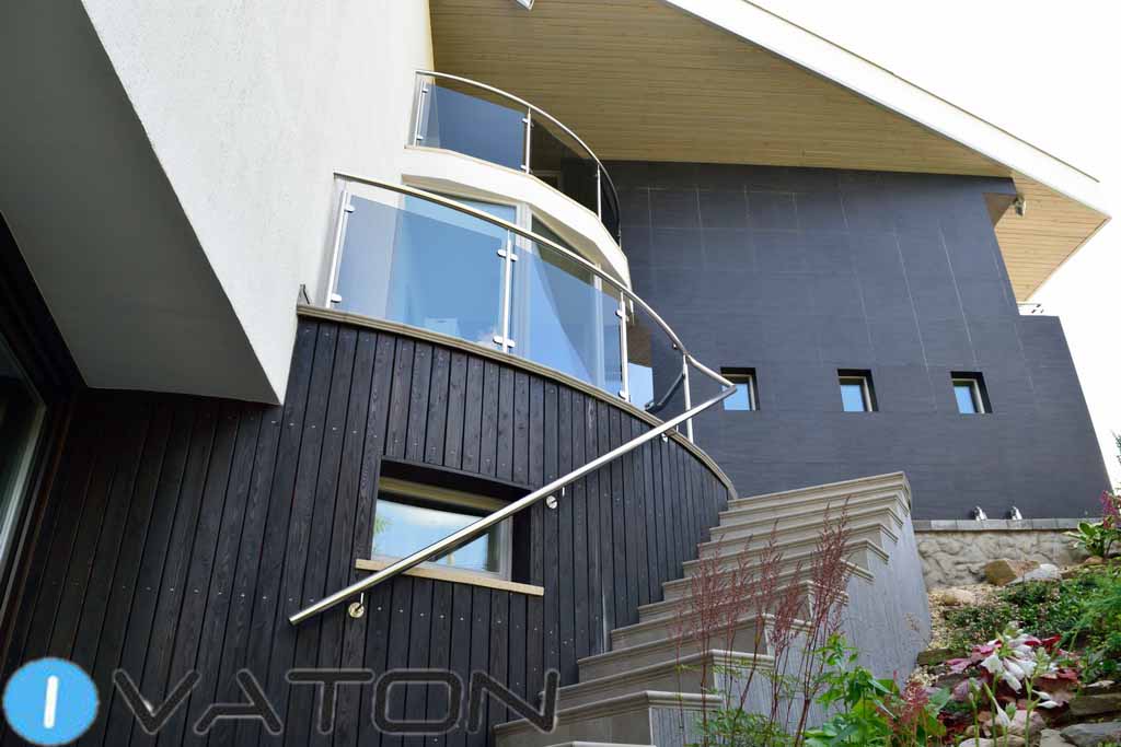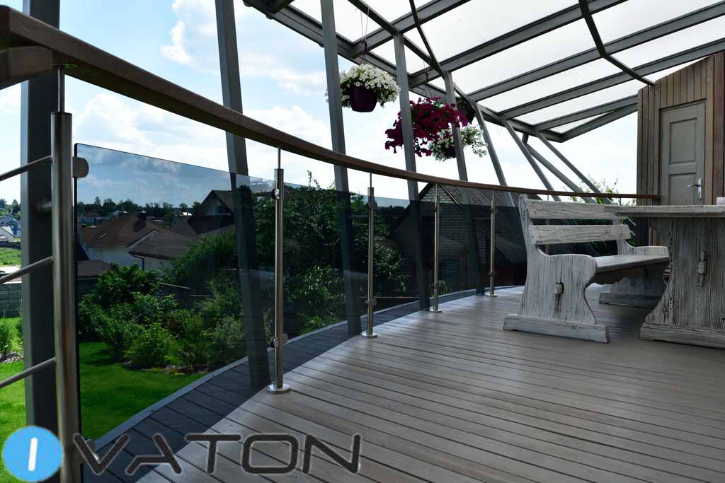 В этом очень интересном ограждени в современном стиле использована комбинация стекла и нержавеющей стали. Дополнение - гнутый поручень террасы из массива дуба.