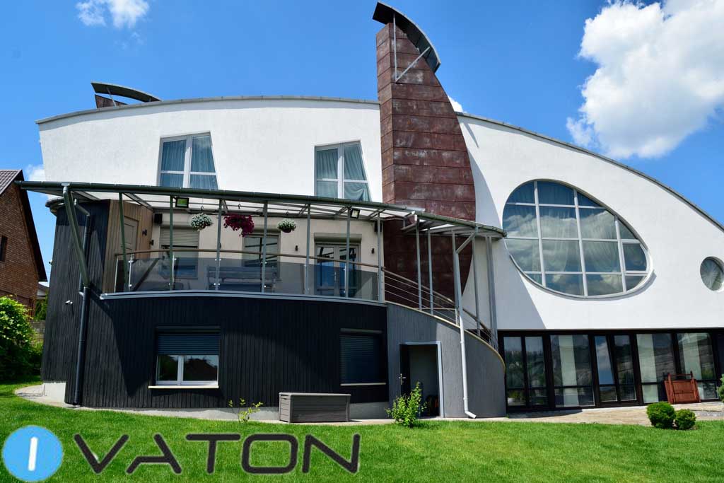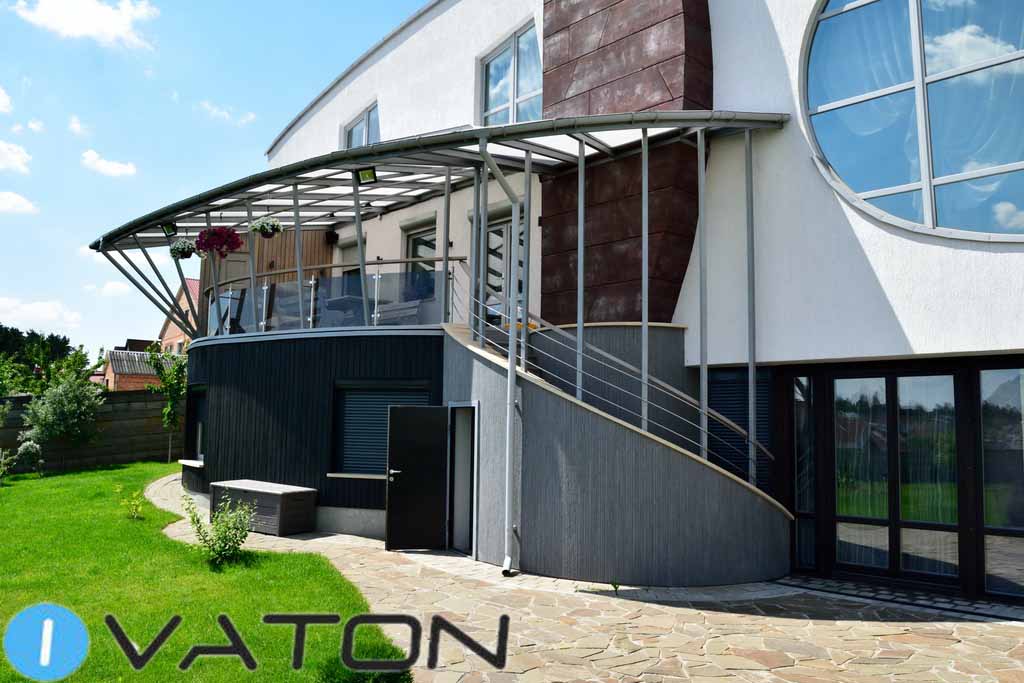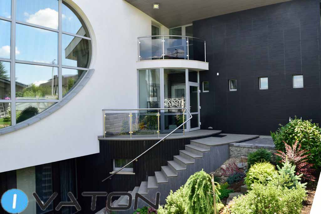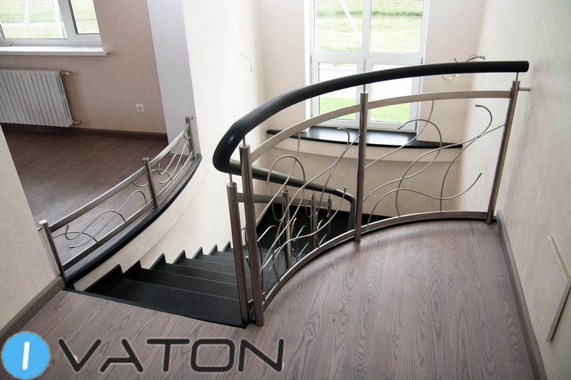Очень интересное ограждение в стиле хай-тек. Особенность – ни одна деталь ограждения не повторяется. Изящные, изогнутые линии ограждения из матовой нержавеющей стали повторяются в плавных линиях круглого поручня.