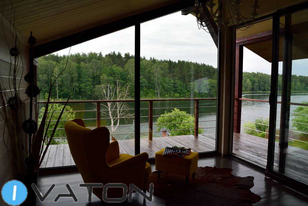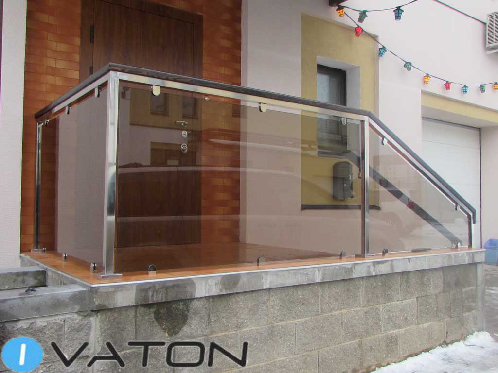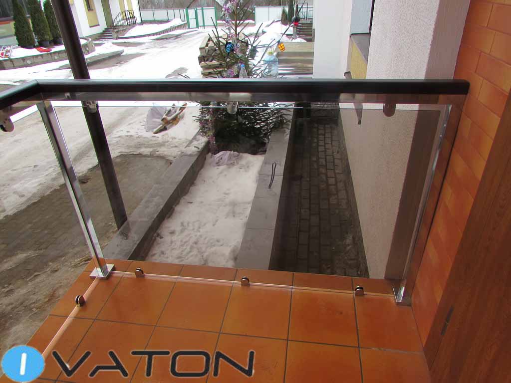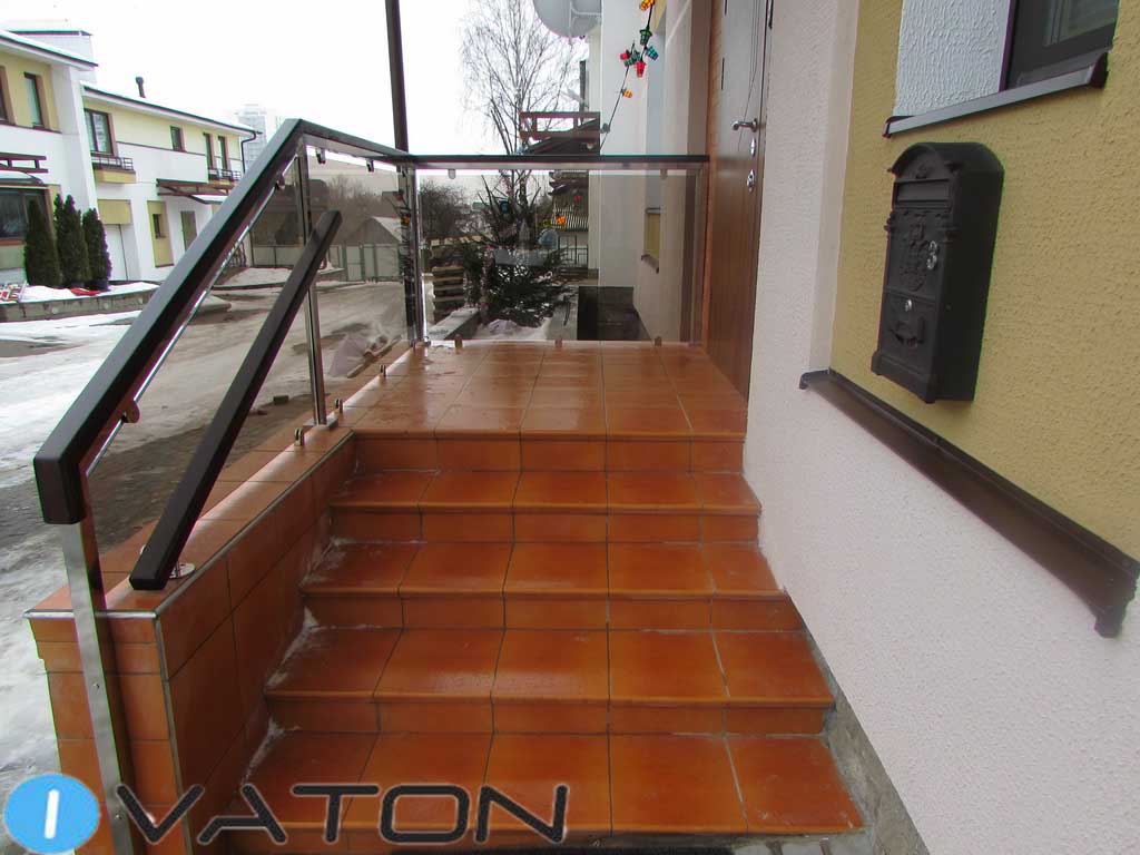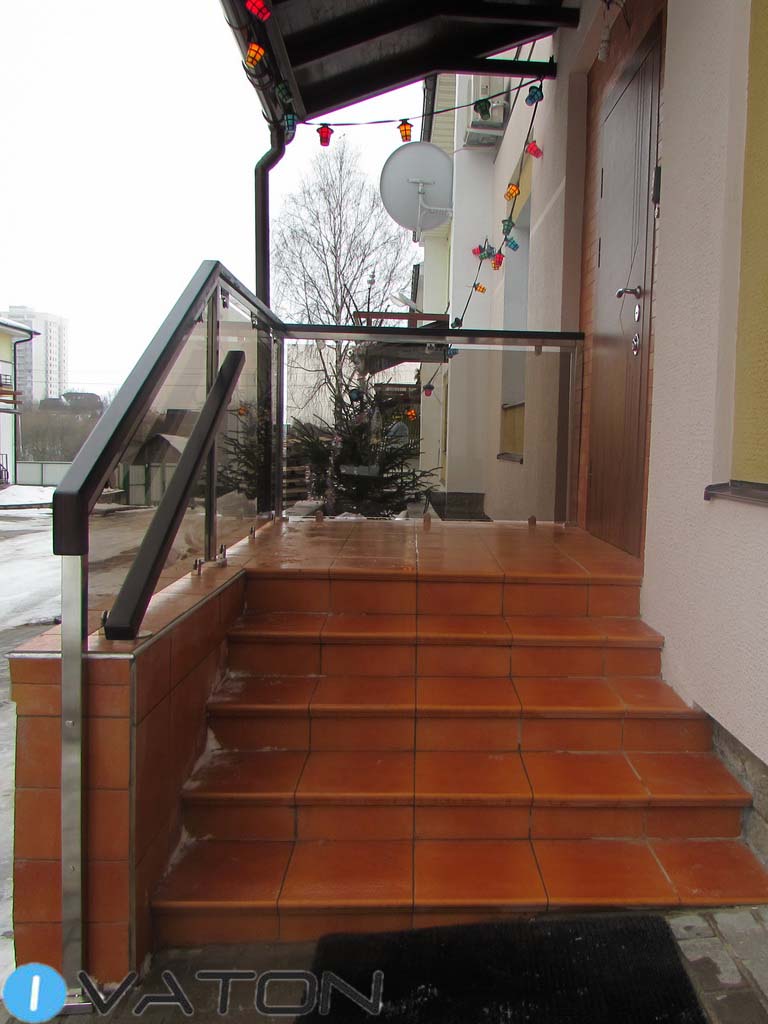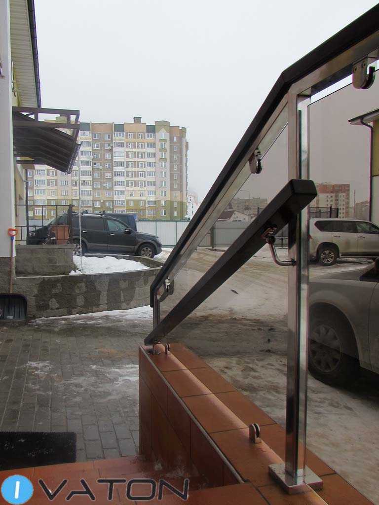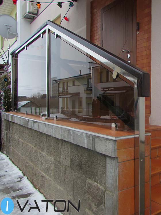Ограждение из тонированного каленого стекла в обрамлении из профильной трубы из нержавеющей стали. Завершение - поручень из тонированной в темный цвет лиственницы. По просьбе заказчика был дополнительно сделан детский поручень. Минск, ул. Школьная, 2014г.