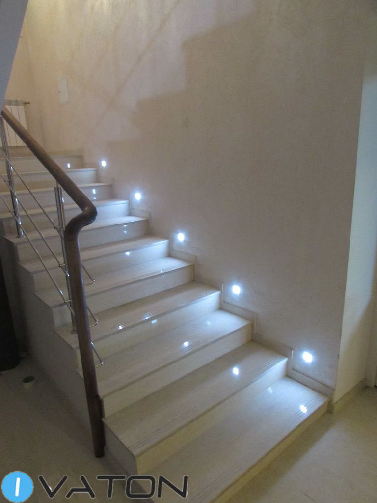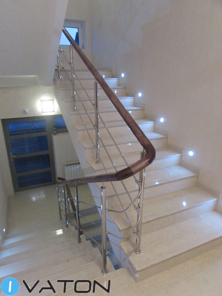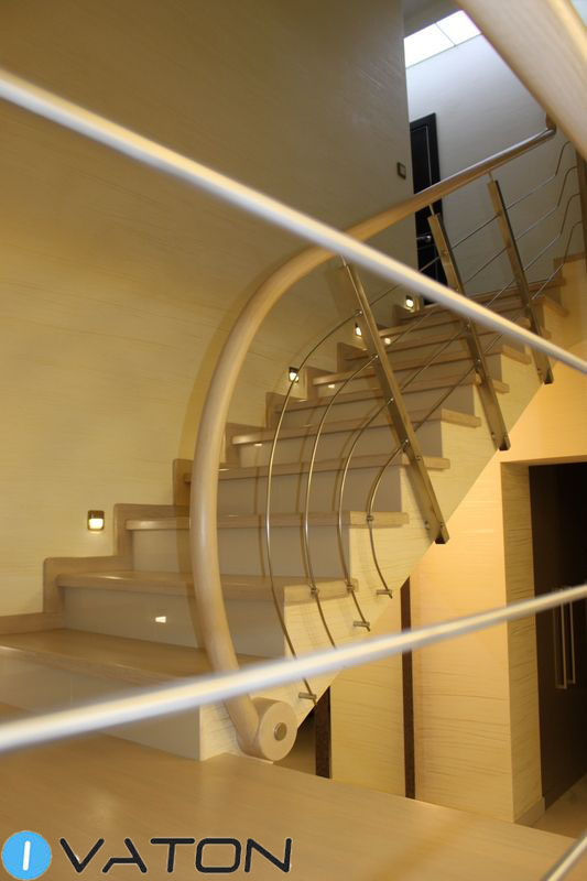 Еще один замечательный вариант сотрудничества с дизайнерами. В ограждении сочетаются квадратные стойки, струны из нержавеющей стали с круглым поручнем. Интересная деталь – закругление ограждения и крепление стоек и струн к торцу лестницы.