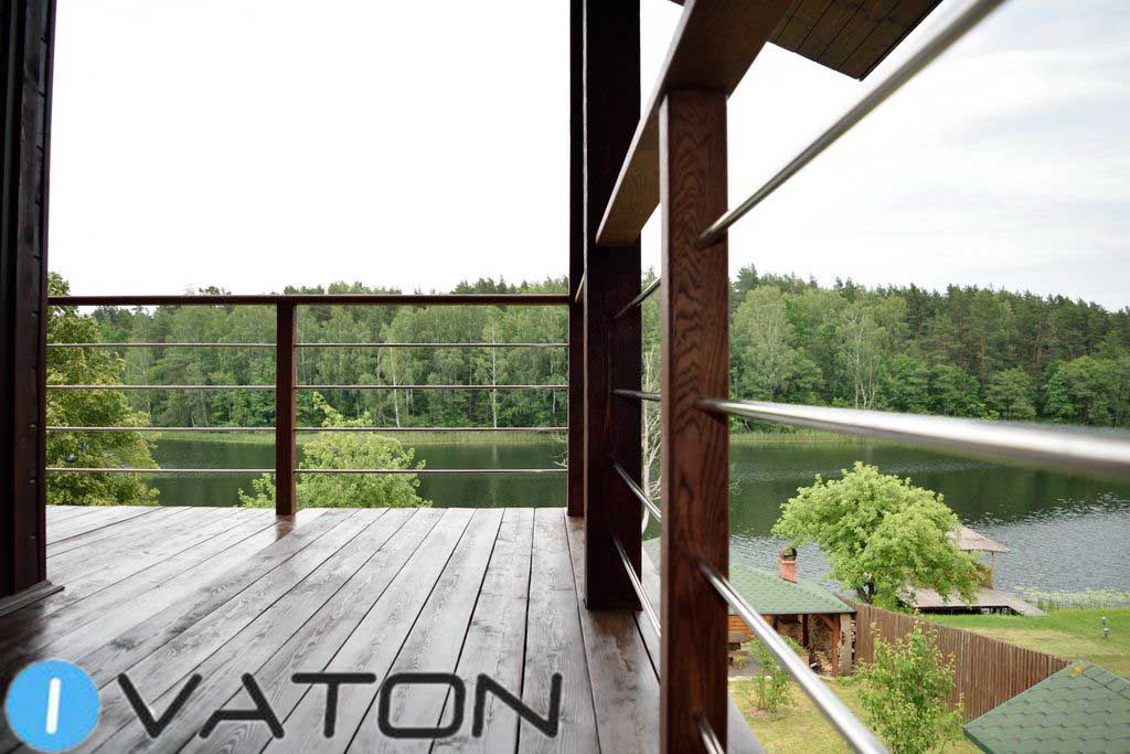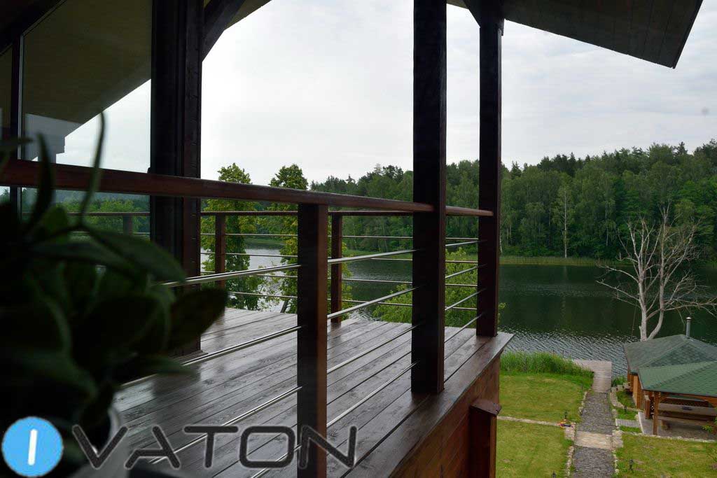 Строгое и лаконичное ограждение балкона, сочетающее деревянные стойки и плоский поручень. Наполнение – струны из нержавеющей стали.