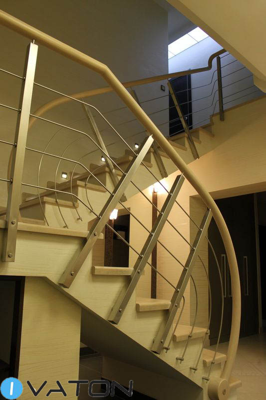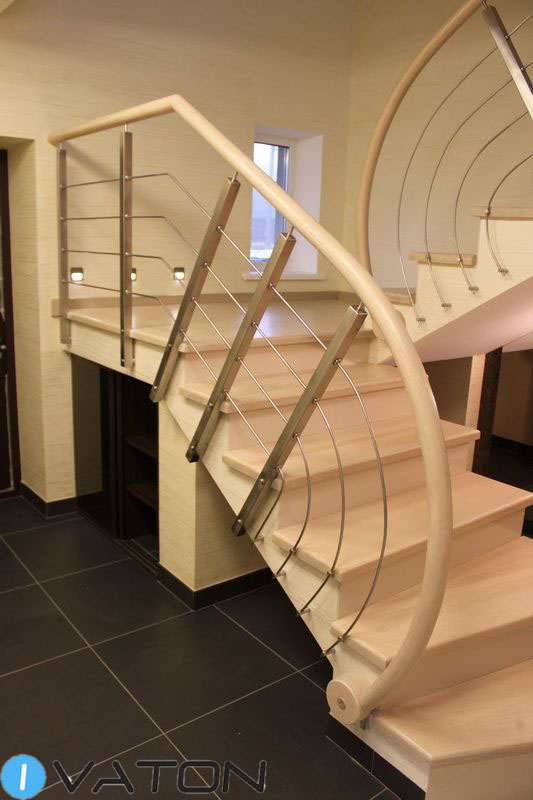 Лестница с комбинированным ограждением. Особый момент – гнутые струны из нержавеющей стали.